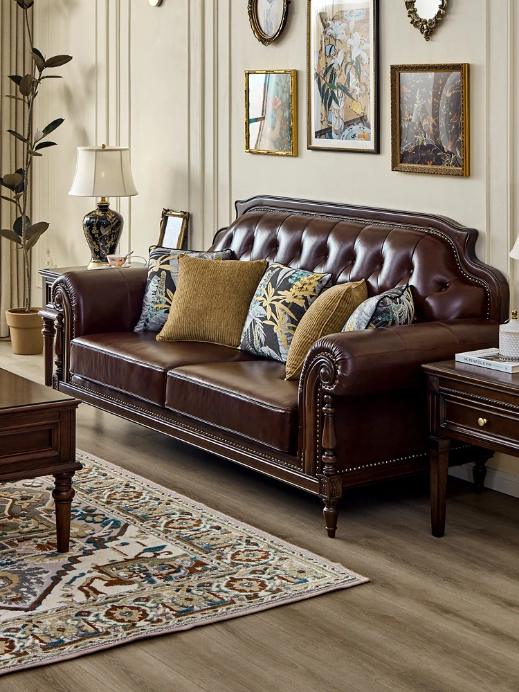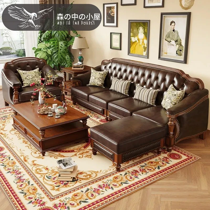 アメリカンレトロ無垢材本革ソファ|上質なトップグレイン牛革使用のリビングルーム向けヴィラ家具|洗練されたシンプルなコンビネーションソファで贅沢な空間を演出!