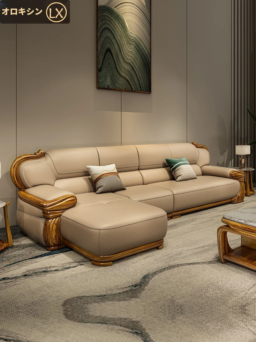 高級ウコン木真皮124ソファセット - ヴィラや大邸宅に最適な新中式モダンラグジュアリー、上質な本革と無垢材を使用した贅沢なデザイン。