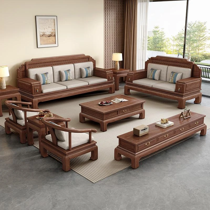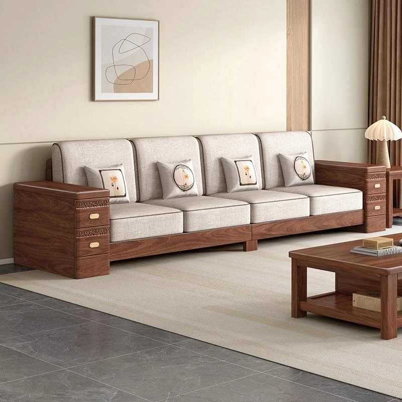 志遠家具の黒胡桃無垢材を使用した収納ソファセット - 新中式デザインで、広いお部屋にも小さなお部屋にもぴったり!収納機能付きで、スッキリとしたリビング空間を実現します。