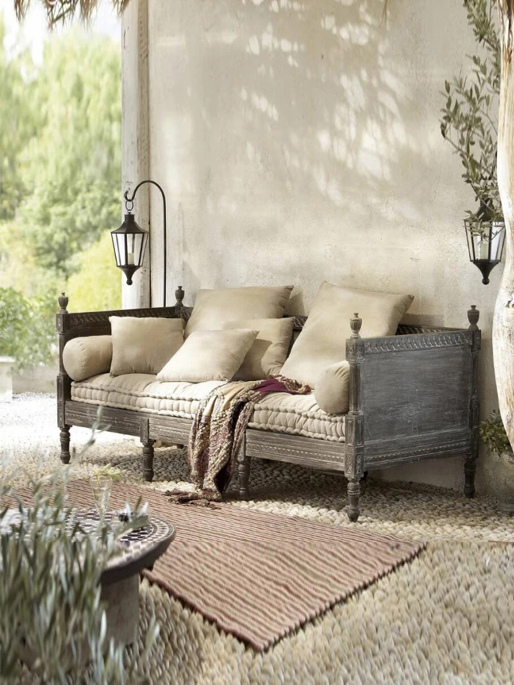 アメリカンヴィンテージ風の無垢材彫刻デザインダブル&トリプルソファ、コンパクトな小型住宅にぴったりなアンティーク仕上げの民宿用ソファベッド。インテリアをおしゃれに演出する家具。