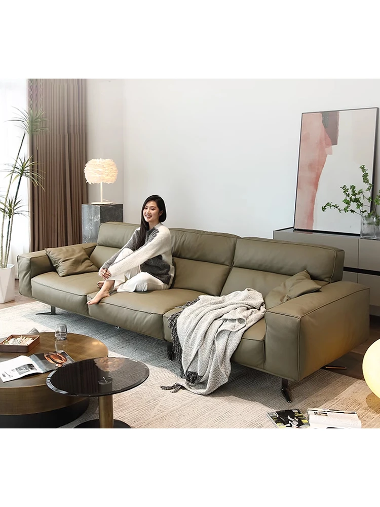 イタリアンミニマリズムの高背豆腐ブロックソファ - 小型住宅に最適な本革4人掛けアボカドグリーンソファ!高品質なトップレザー使用で、スタイリッシュさと快適さを両立。おしゃれな空間を演出します!