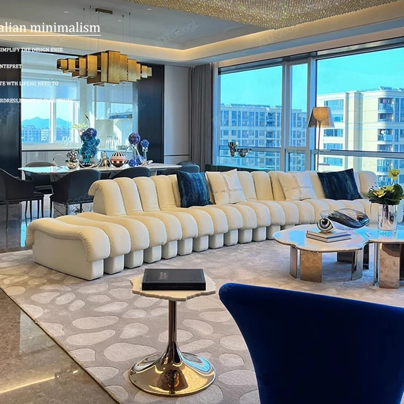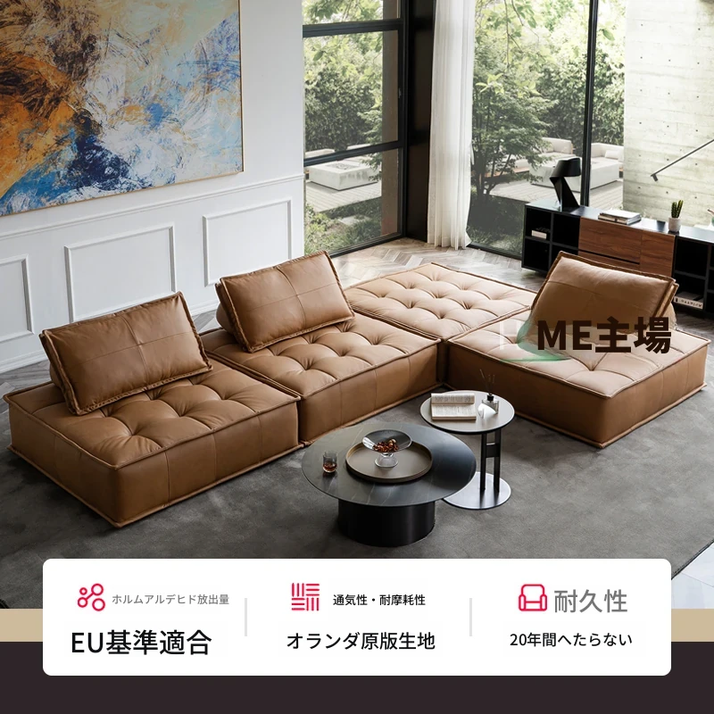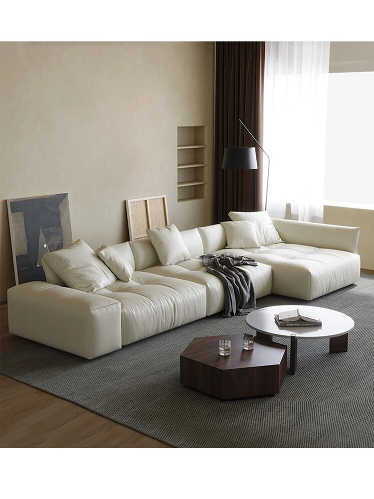 イタリア製本革ソファ|モダンミニマルなデザイン|高級ヴィラ向けの広々としたL字型モジュラーソファ|快適な豆腐ブロックスタイルで優雅な空間を演出!