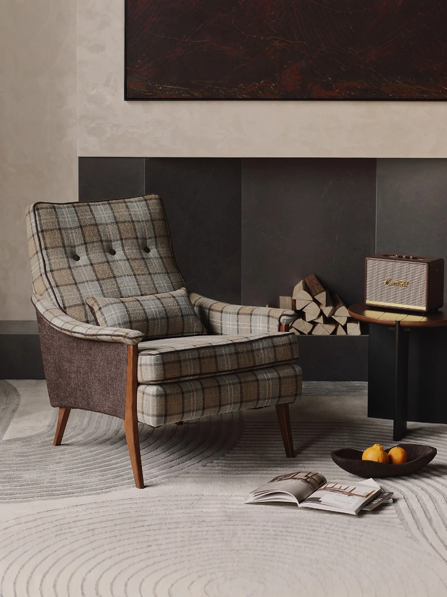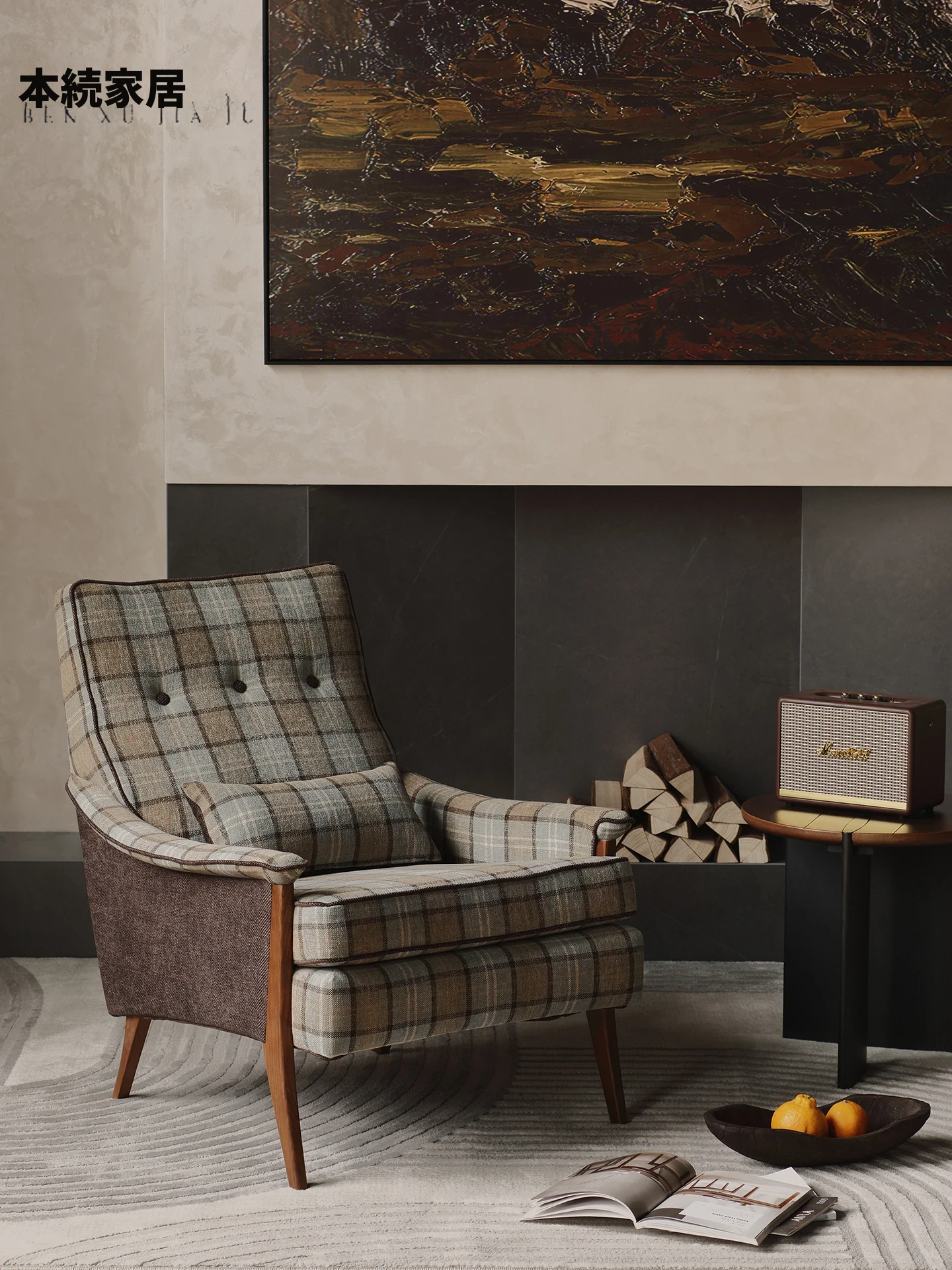 一人掛けアメリカンソファ・虎の椅子・布製リラックスチェア・快適なチェック柄・レトロな無垢材・スタイリッシュな単独椅子!おしゃれな空間を演出する、居心地抜群のアイテムです。
