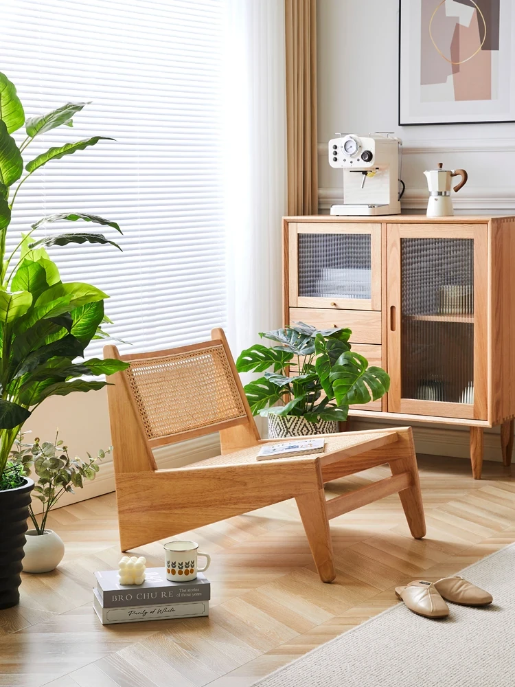 Wabi-Sabi Style Single Sofa Chair - Vintage Rattan Backrest Chair for Airbnb, Designer Home Balcony, Solid Wood Lazy Lounge Chair