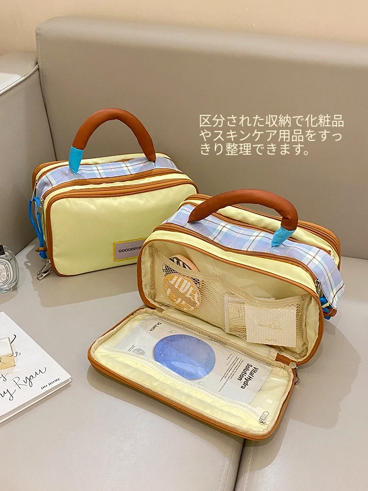 トラベル用チェック柄メイクポーチ - 大容量で機能的!スキンケアや洗面用具を整理整頓できる便利な仕分け収納バッグで、外出時もスタイリッシュに。