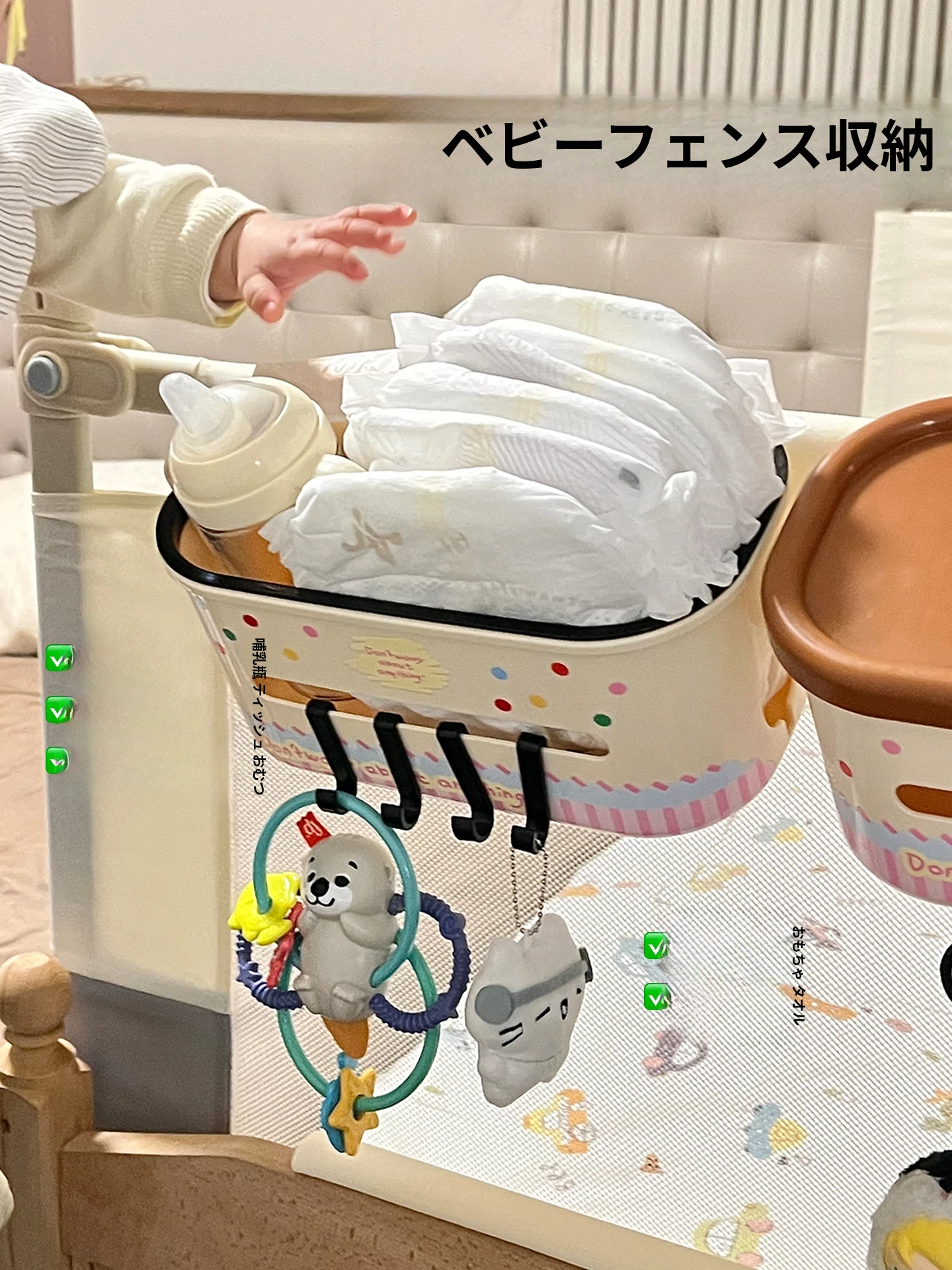 ベビーベッドサイドハンギングバスケット|おむつ収納ボックス・おしゃれな置物ラック|赤ちゃんのための必須アイテム!ママと赤ちゃんの生活をもっと便利にする収納グッズ!