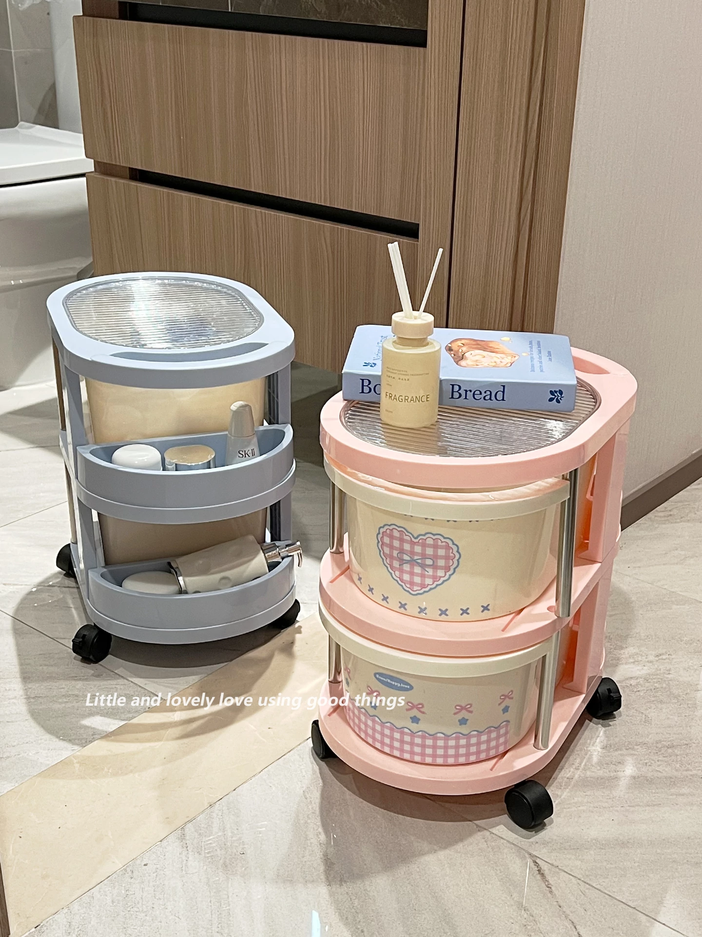 移動式2段収納ラック - テーブル下やベッドサイドに最適!お菓子や化粧品、本をスッキリ整理!スタイリッシュで便利な小推車タイプ、あなたの生活空間をおしゃれに演出します!