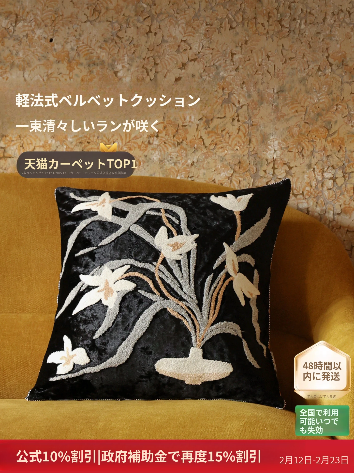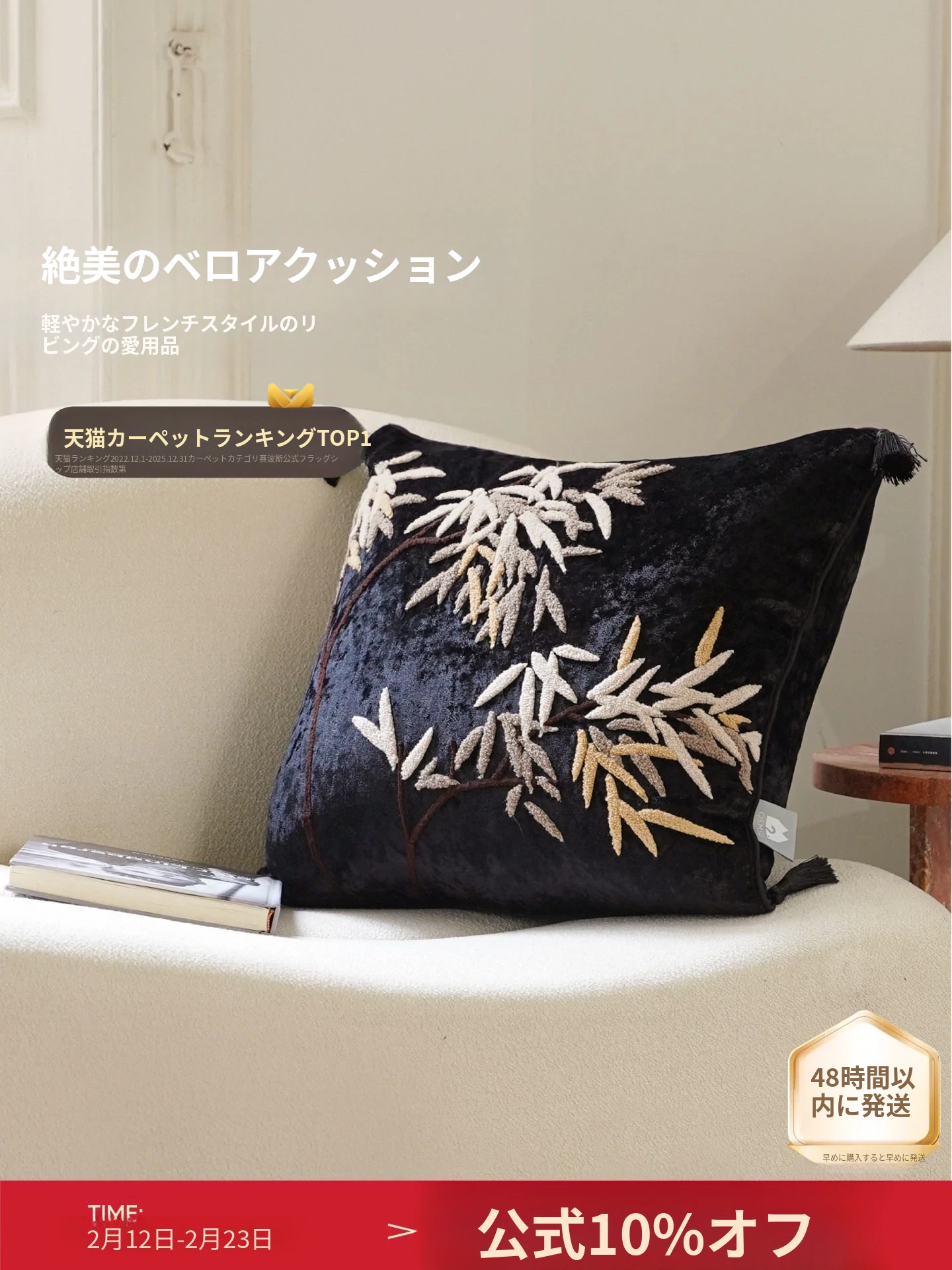 サイボス青山美宿ガーデンショー クッション ベルベット質感 刺繍デコレーション リビングソファ用 ラグ・クッションでおしゃれな空間を演出!