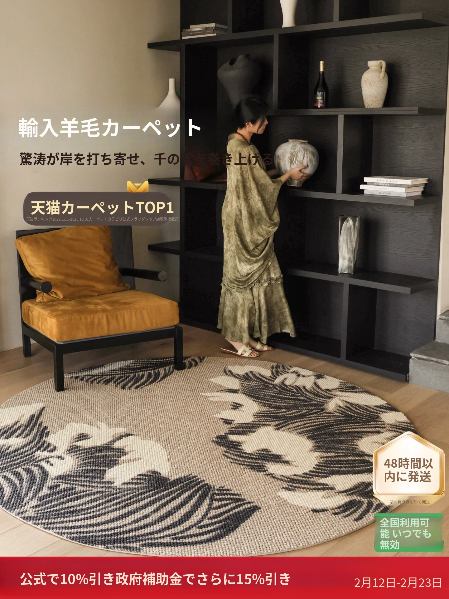 人気のサイポススタイル!フレンチラグジュアリー円形カーペット、防水・ノーグルー仕様でリビング・寝室・ベッドサイド・クローゼットに最適!おしゃれで機能的な空間を演出します。