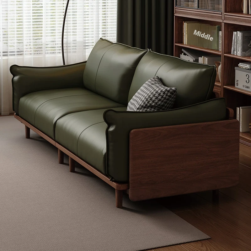 Italian Minimalist 2025 New Black Walnut Solid Wood Sofa - Straight Mid-Century Modern Leather Sofa for Living Room, Perfect for Elegant Home Décor