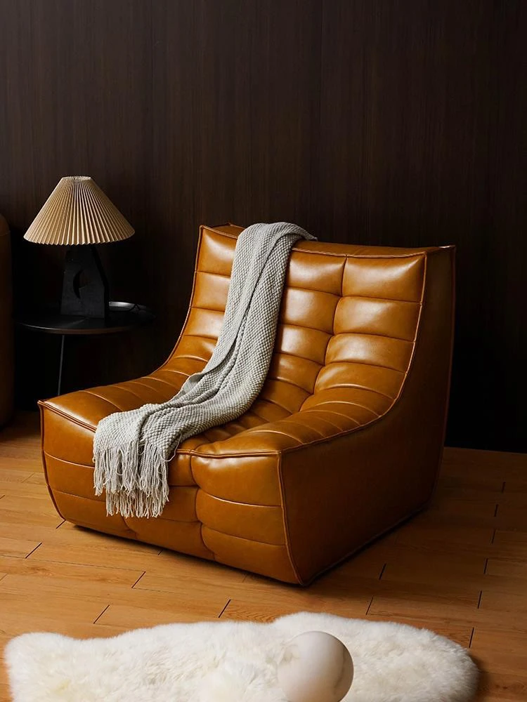 Vintage Single Sofa Chair in Genuine Leather - Retro Waxed Fabric with Waffle Design, Modern Minimalist Corner Lounge Furniture for Living Room