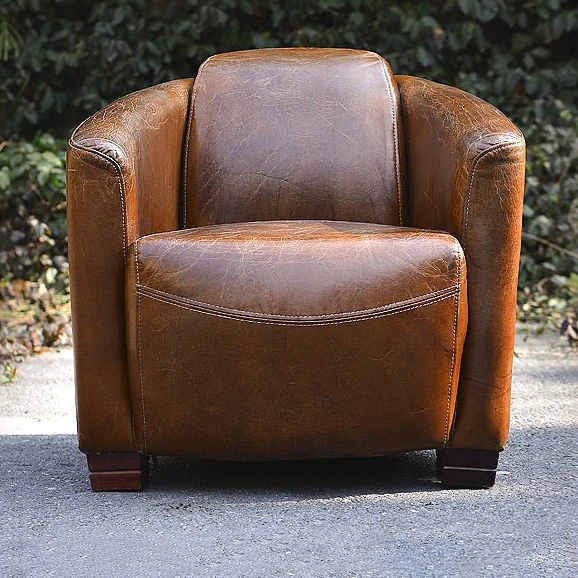 Vintage American Waxed Leather Single Sofa - Classic Retro Solid Wood Design for Living Room, Ideal for Whiskey and Cigar Bars, French Style