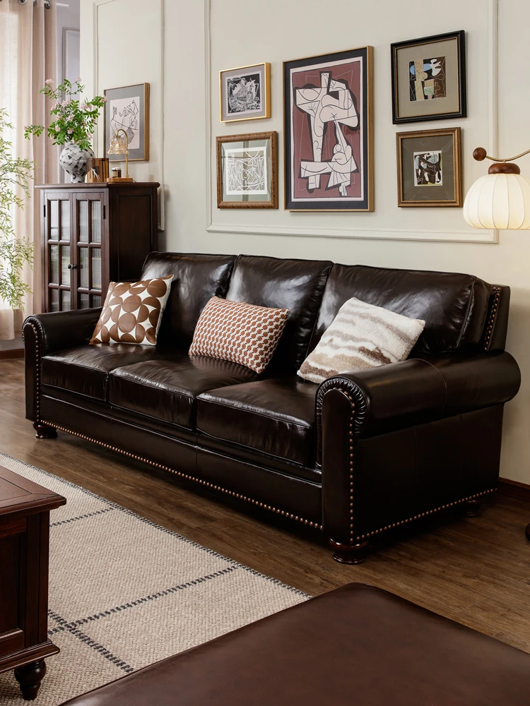 American Vintage Solid Wood Genuine Leather Sofa - Top Grain Cowhide - Compact Modular Design for Small Spaces - Retro Style Living Room Furniture