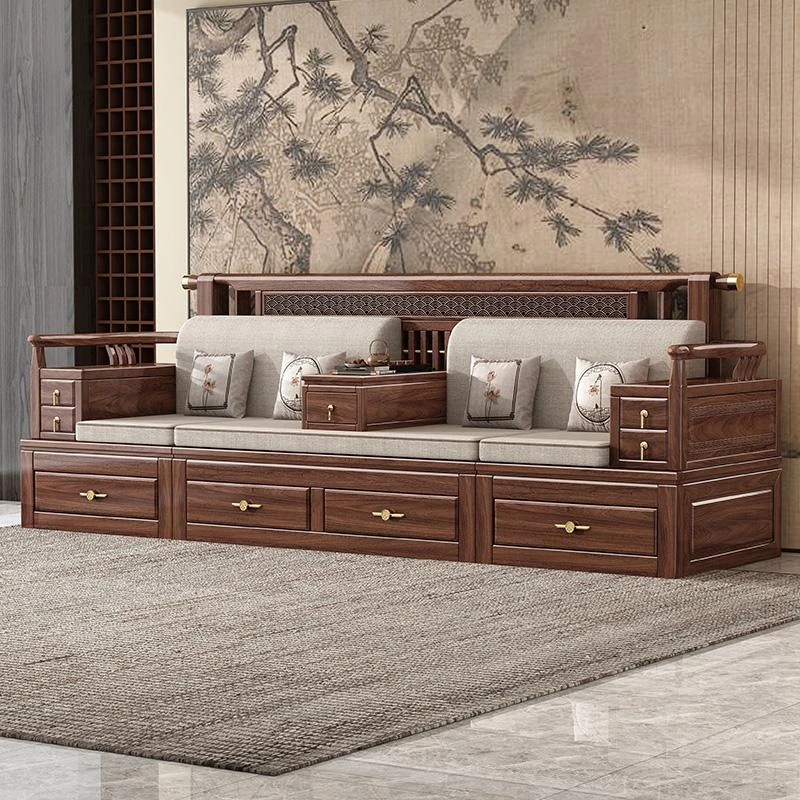 ZhiYuan Furniture New Chinese Style Solid Wood Sofa Set - Versatile Black Walnut Living Room Sofa for All Seasons with Storage Solutions in Nordic Design