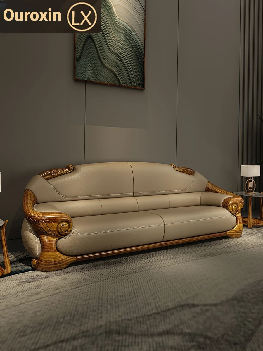 Luxury European-style Solid Wood Sofa Set in Wenge Wood with Genuine Leather - Exquisite Carvings for High-End Villas and Spacious Living Rooms, Featuring Top-Grade Cowhide Upholstery. Perfect for Elegant Interiors!