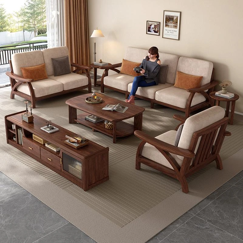 ZhiYuan Furniture New Chinese Style Solid Walnut Wood Sofa - Modern Minimalist Design for All Sizes of Living Rooms, Perfect for Home Use.