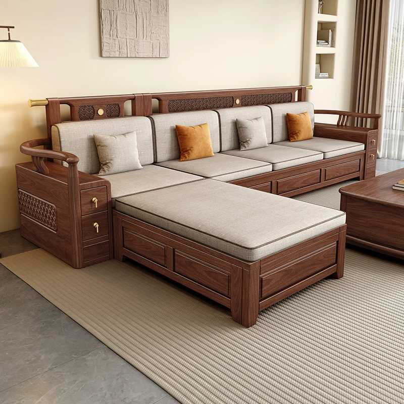Modern Chinese-style Solid Wood Sofa in Black Walnut with Corner Chaise and Storage – Ideal for Small to Medium Living Rooms, Combining Simplicity and Functionality.