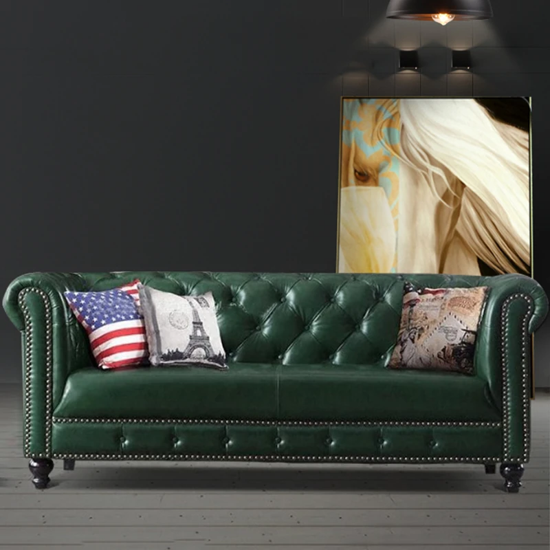 American Light Luxury Oil Wax Leather Sofa with Rivets - Vintage Green Genuine Leather for Living Room and Hotel Lobby Furniture