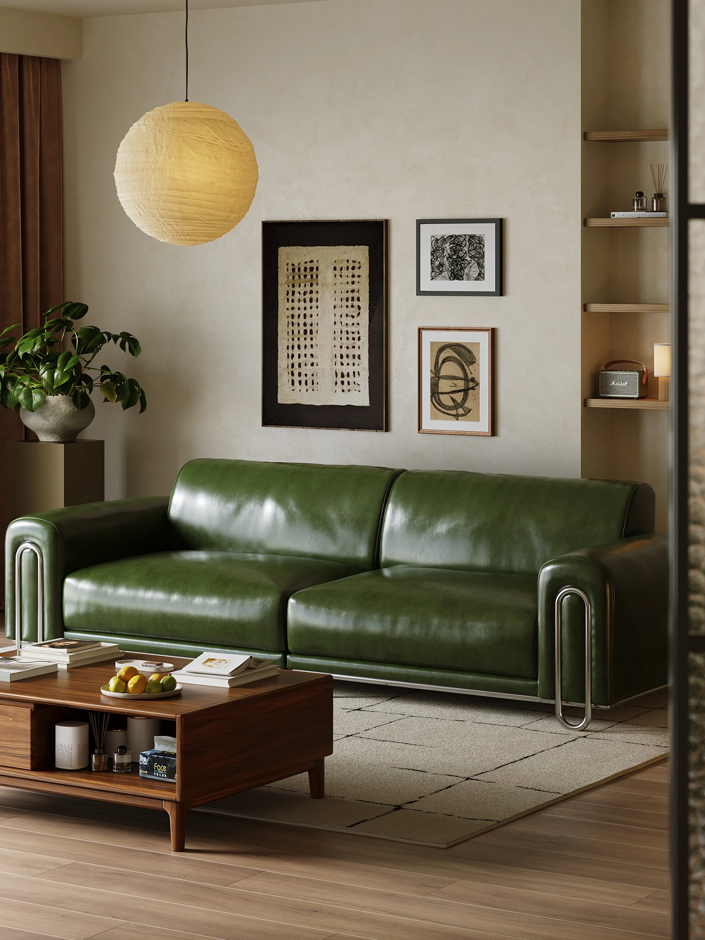Italian Minimalist High-Back Tofu Block Sofa for Small Spaces - Premium Top-Grain Leather 4-Seater in Avocado Green - Perfect for Stylish Living Rooms!