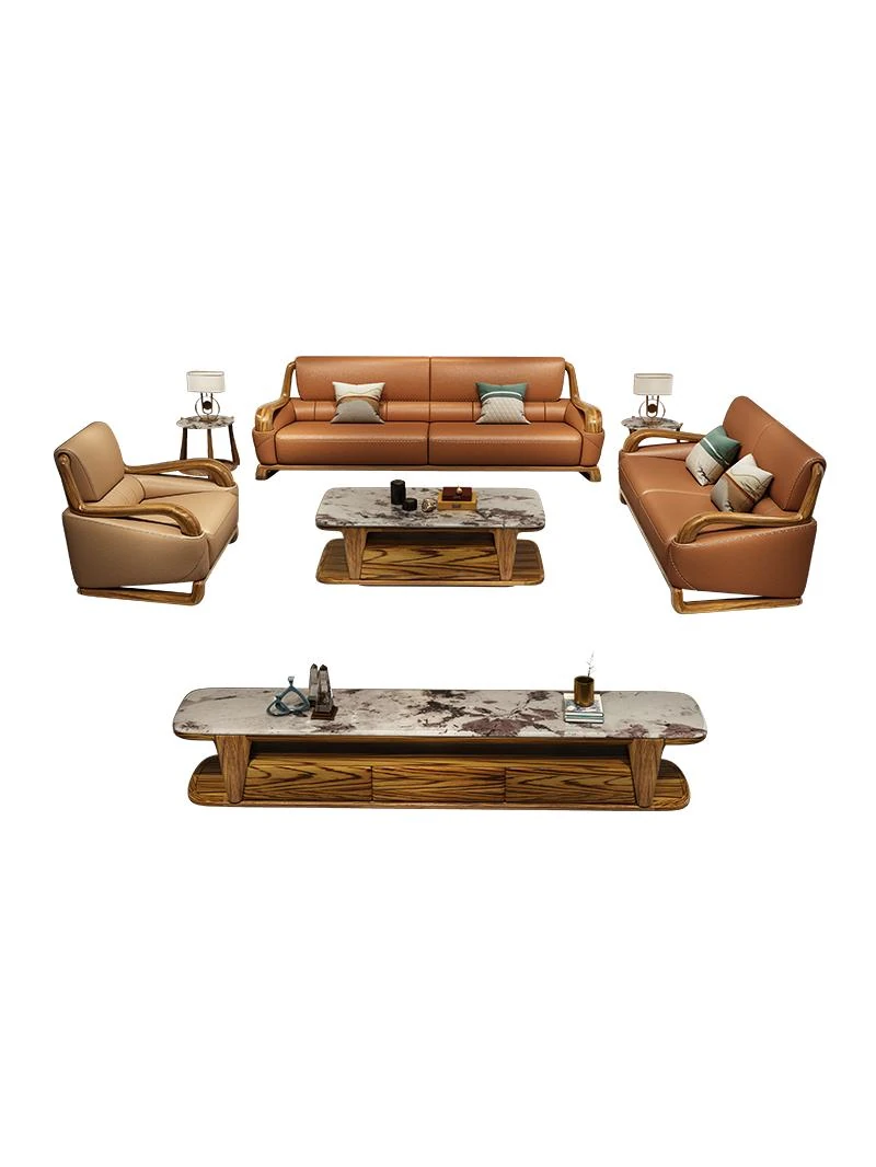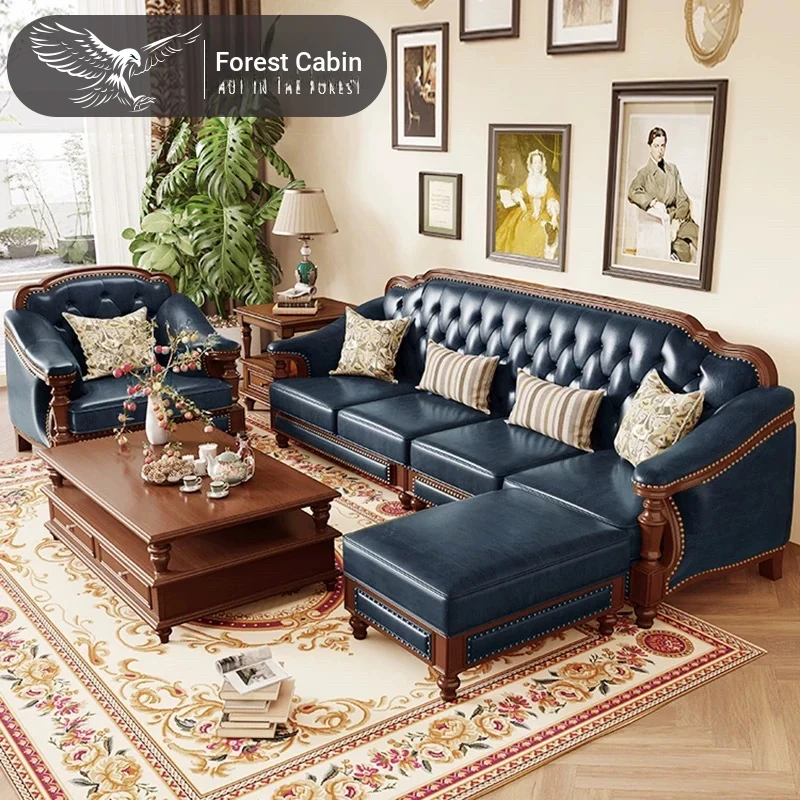 American Vintage Solid Wood Genuine Leather Sofa Set - Premium Top-Grain Cowhide 123 Combination, Chic Minimalist Country Style Living Room Furniture