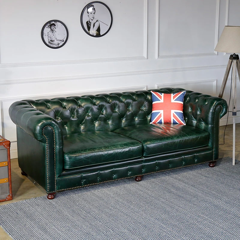 Luxury Italian Imported Genuine Leather Retro Sofa Set for Villa Living Room - Premium Waxed Top Grain Cowhide, Stylish and Comfortable 3-Seater Design