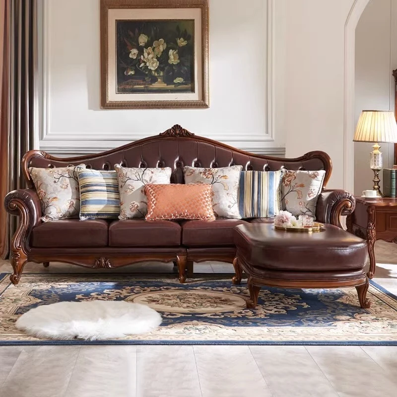 American Style Solid Wood Leather Corner Sofa Set - Luxurious European Four-Seater L-Shaped Sofa with Simple Chaise Lounge for Ultimate Comfort and Elegance