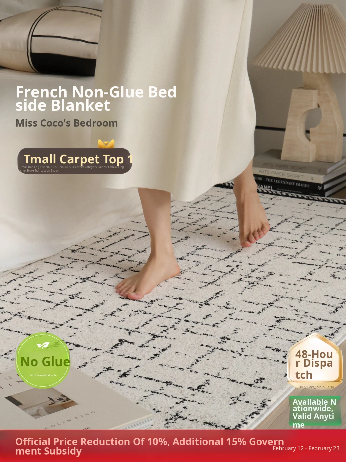 Sybos Glue-Free, Formaldehyde-Free Bedroom Bedside Rug - Elegant French-Style Anti-Bacterial End of Bed Carpet for a Luxurious Stay in the Mountains