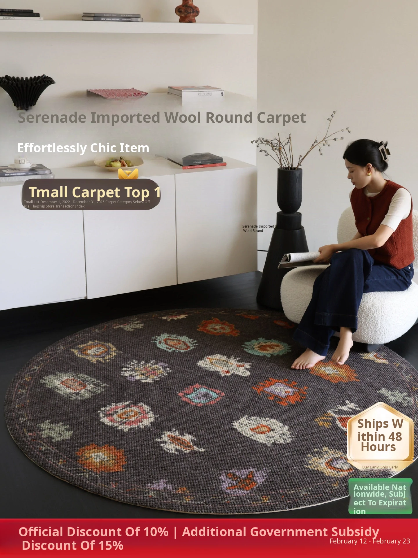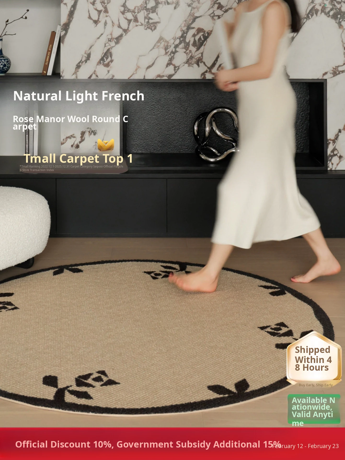 Seipos Rose Manor Premium Round Wool Carpet - Elegant French Design for Living Room, Bedroom, Walk-in Closet, or Bedside - Perfect for Your Stylish Retreat