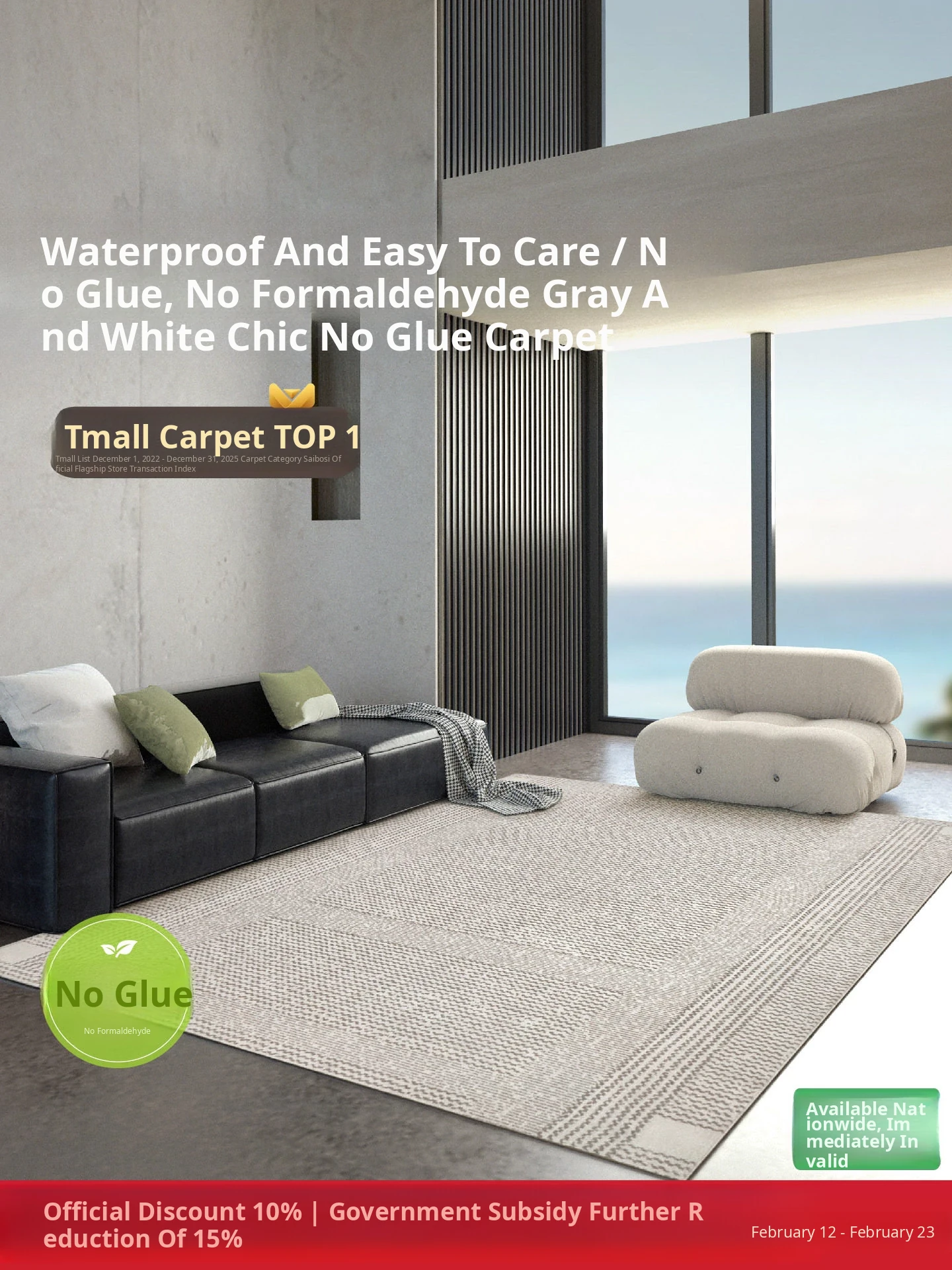 Seaboss No Glue Living Room Carpet - Bamboo Fiber, Modern Luxury Style, Waterproof, Stain Resistant, Antibacterial, Ideal for Bedroom and Cozy Spaces
