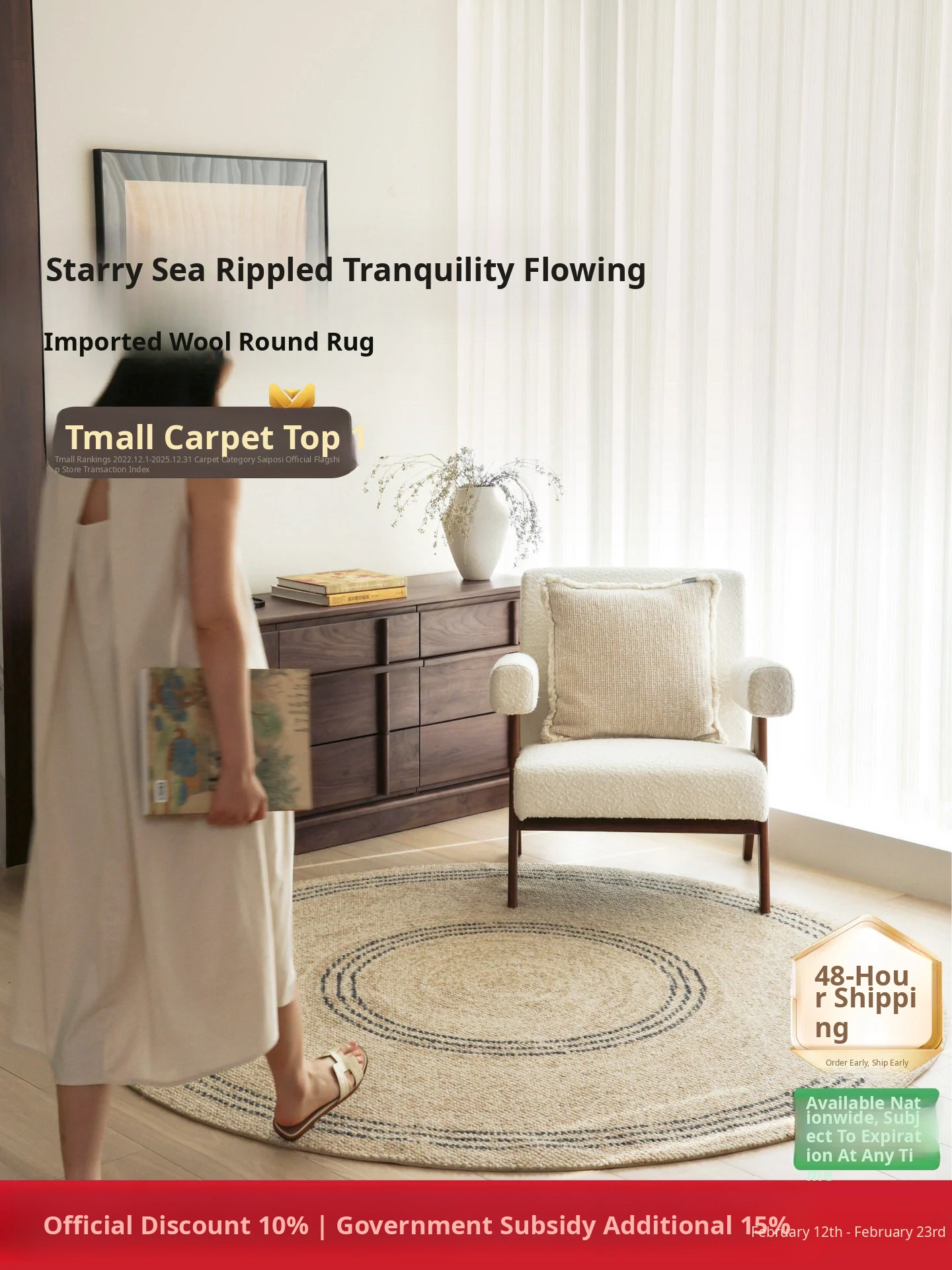Imported Cybopus Star Sea Wool Round Rug – New Chinese Style Natural Wood Design for Living Room and Bedroom, Perfect for Bedside Comfort