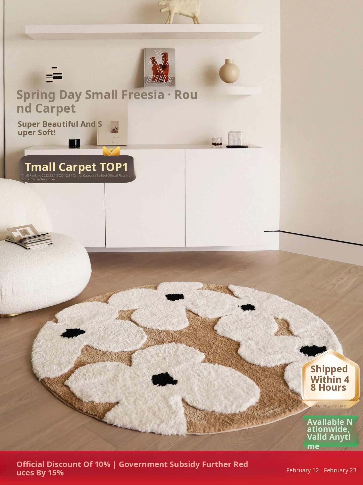 Luxurious French Cream Soft Round Carpet with Freesia Design – Perfect for Your Bedroom, Living Room, or Walk-in Closet. Elevate Your Space with This Elegant Home Décor!