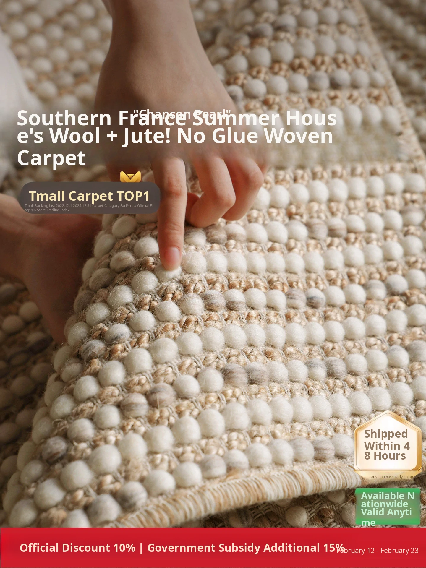 Seaboss Fragrant Pearl Imported Wool and Jute Non-Adhesive Woven Carpet - Luxurious and Elegant Area Rug for Living Room and Bedroom, Perfect for Modern Sofas