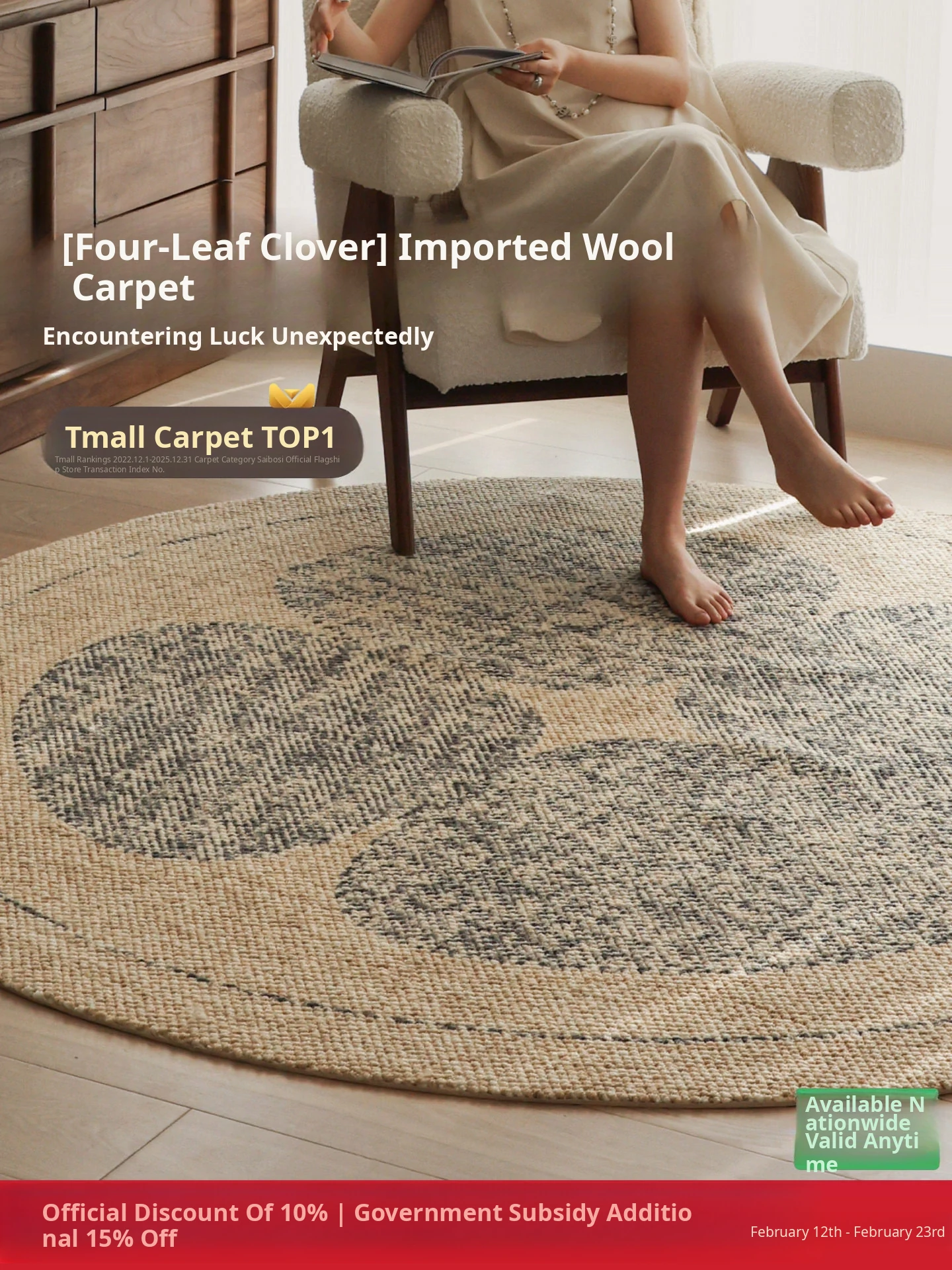 Sibos Clover Imported Wool Round Rug - Luxurious New Chinese Style Natural Wood Design for Living Room and Bedroom, Perfect Bedside Mat