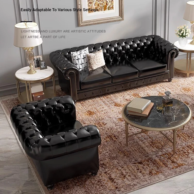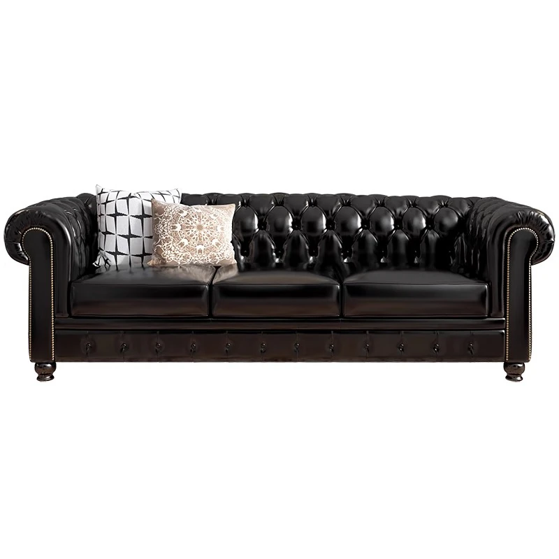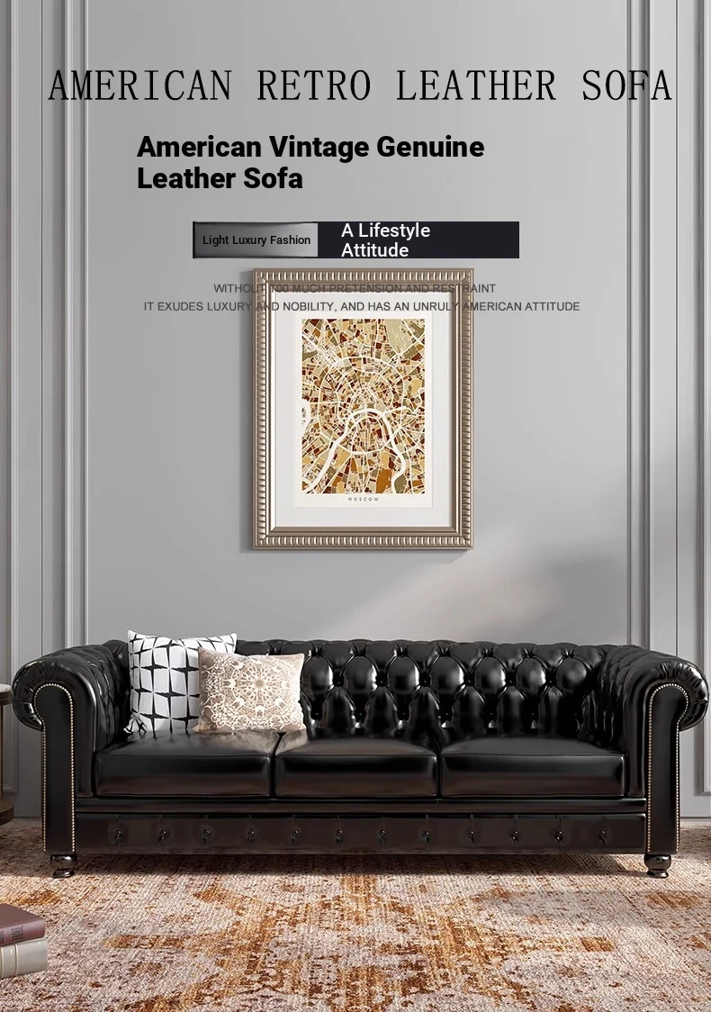 American Style Luxurious Genuine Leather Sofa - Vintage Button-Tufted Cigar Room Hotel Three-Seat Sofa in Top-Grain Cowhide