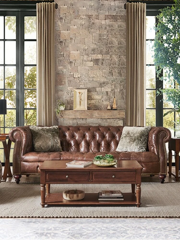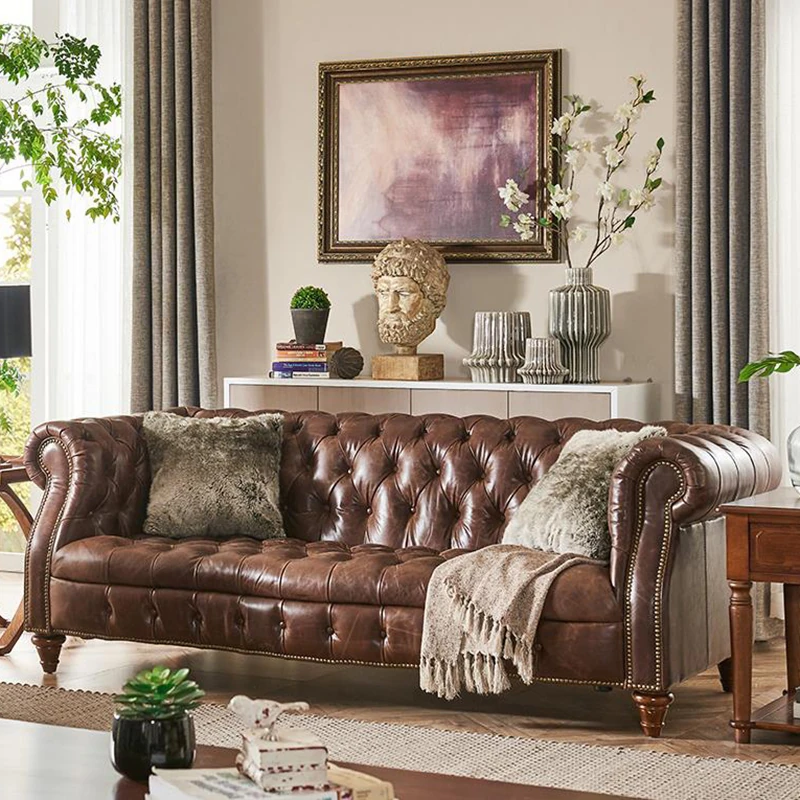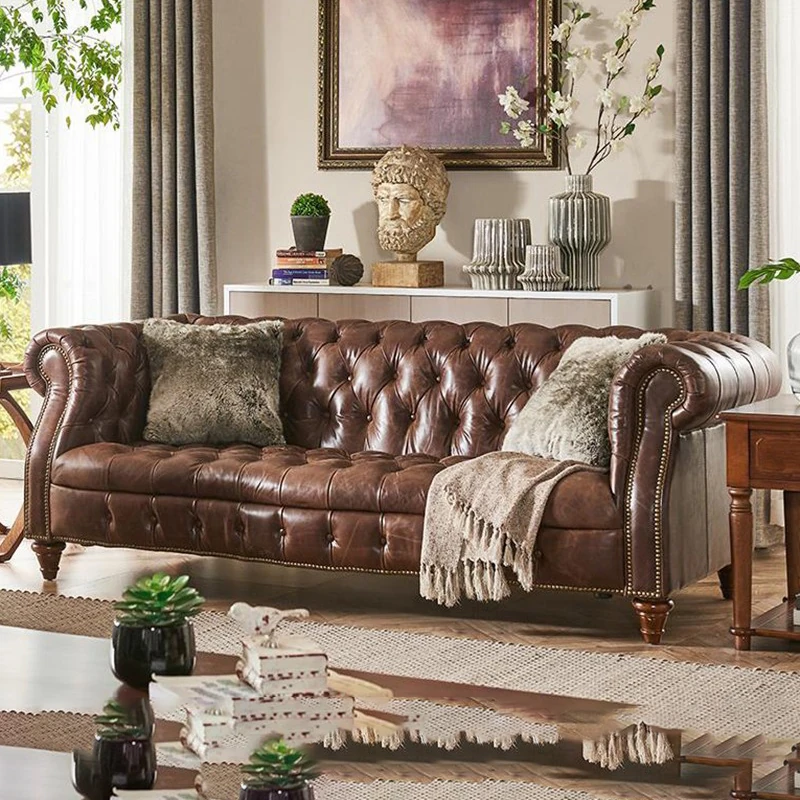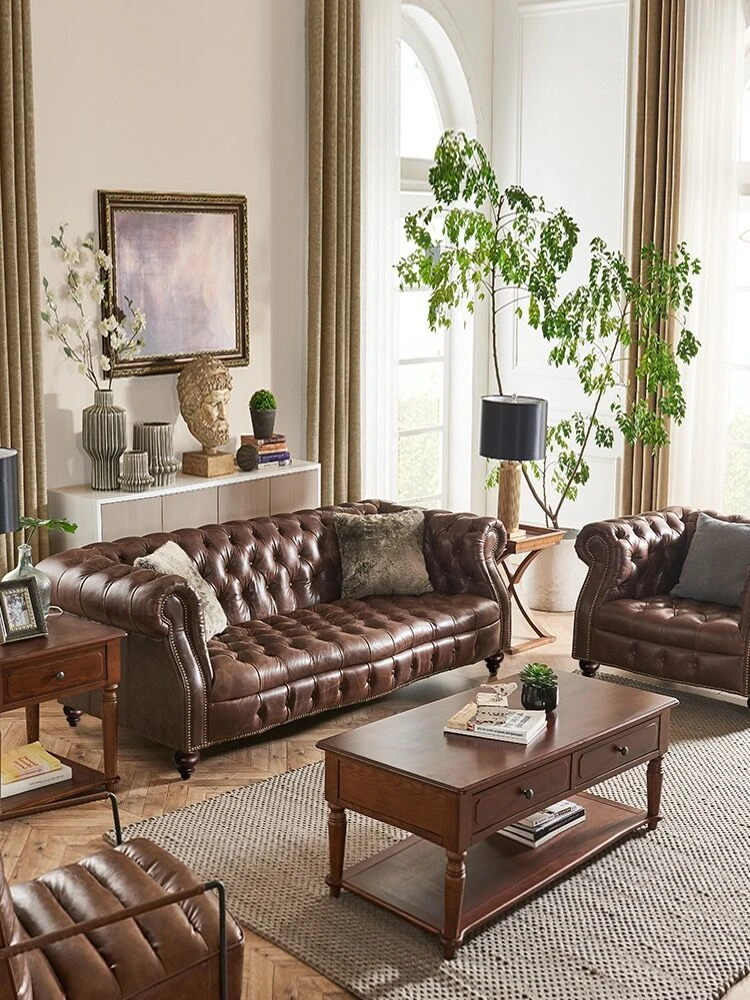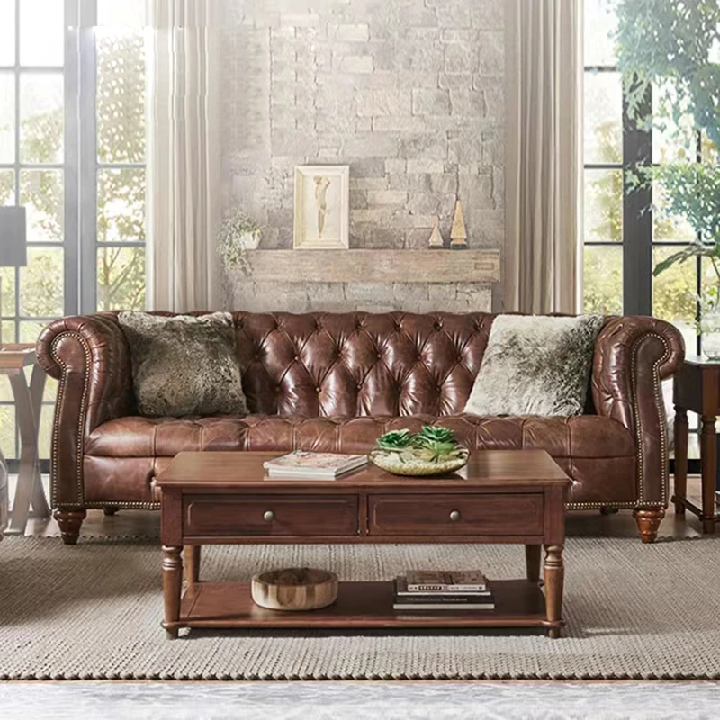 Luxury American Genuine Leather Sofa Set - Vintage Style Top-Grain Waxed Leather for Living Room - 123 Combination Cigar Bar Sofa