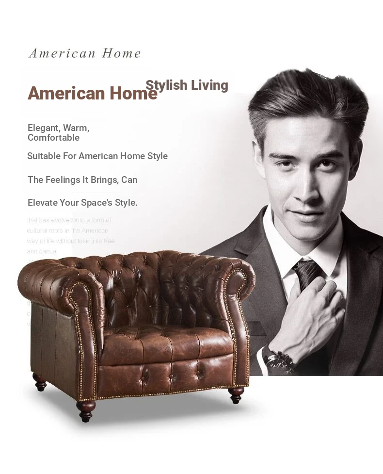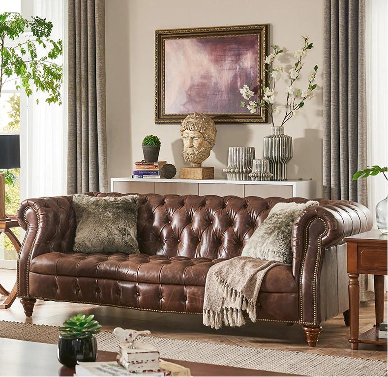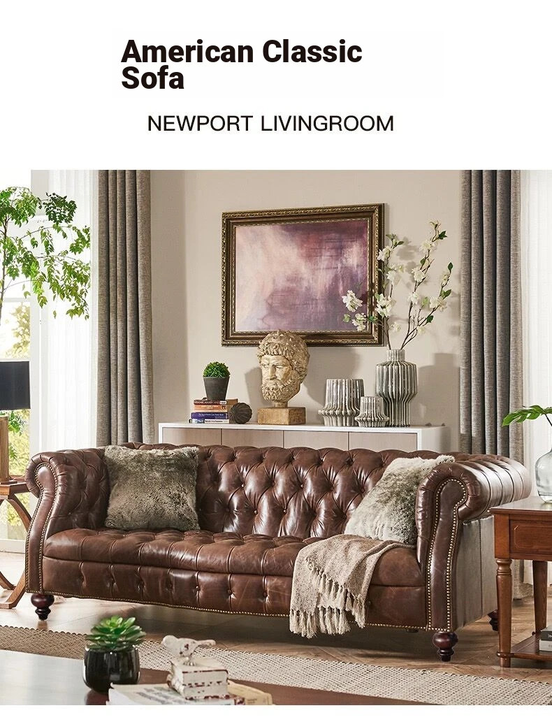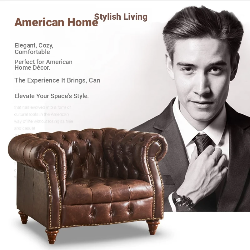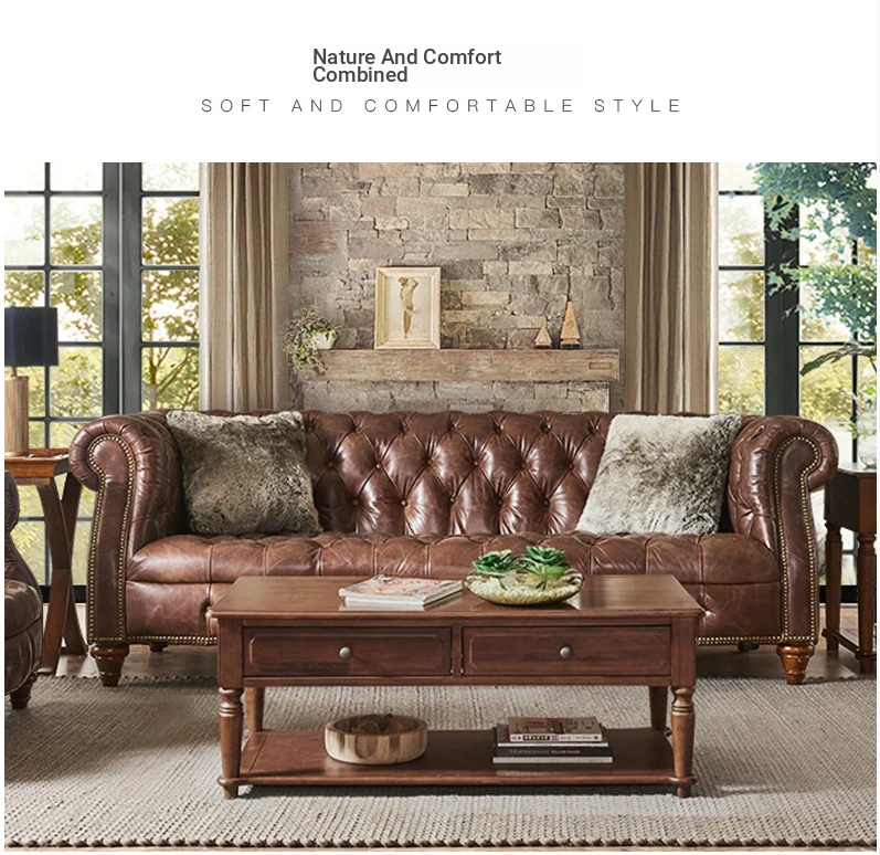 Luxury American Genuine Leather Sofa Set - Vintage Style Top-Grain Waxed Leather for Living Room - 123 Combination Cigar Bar Sofa