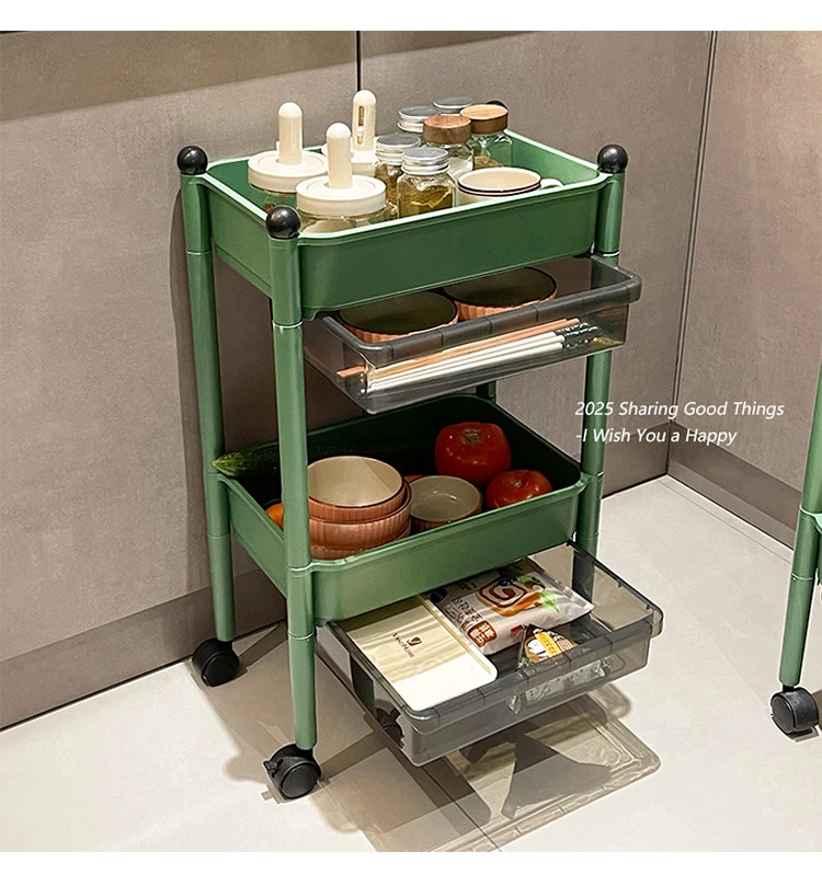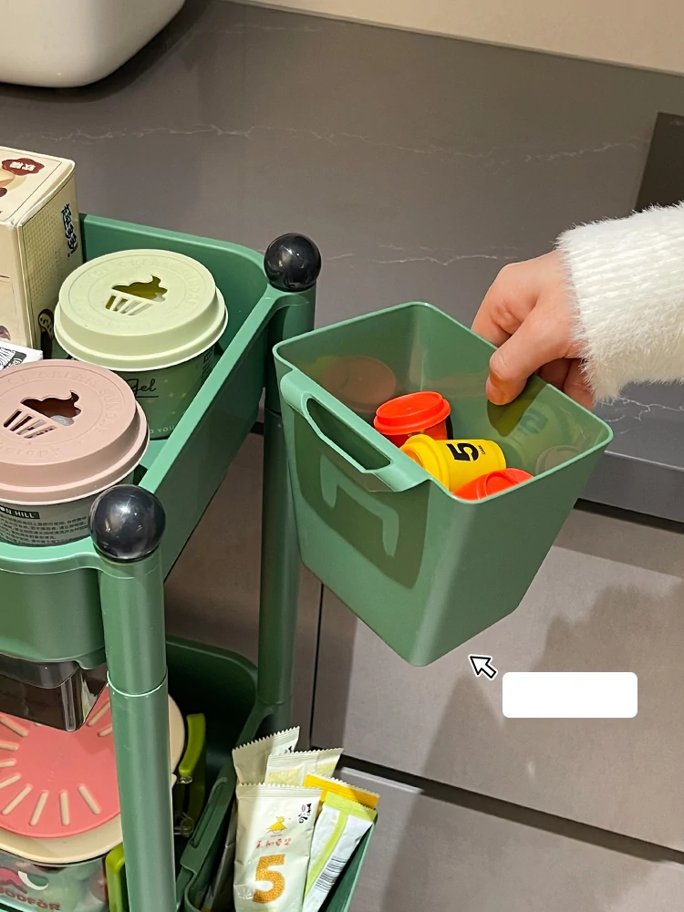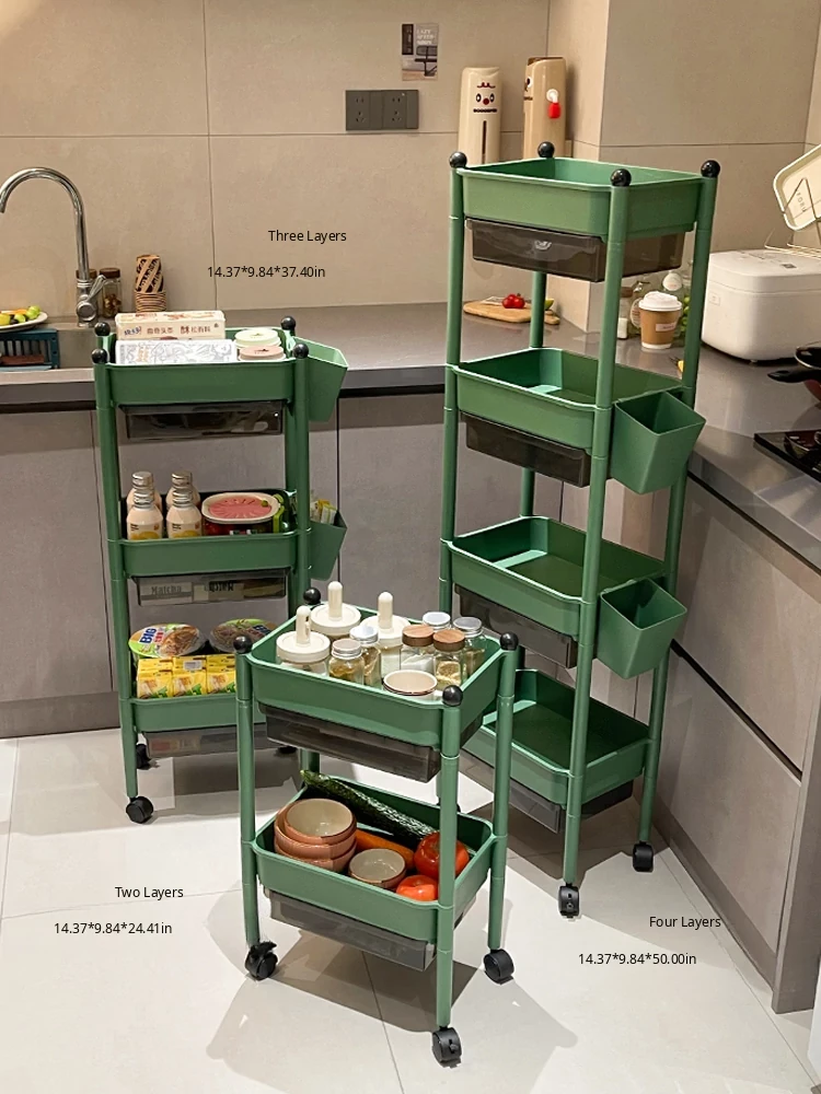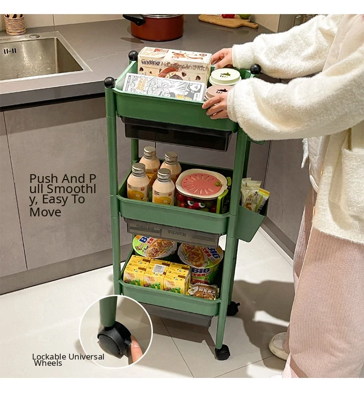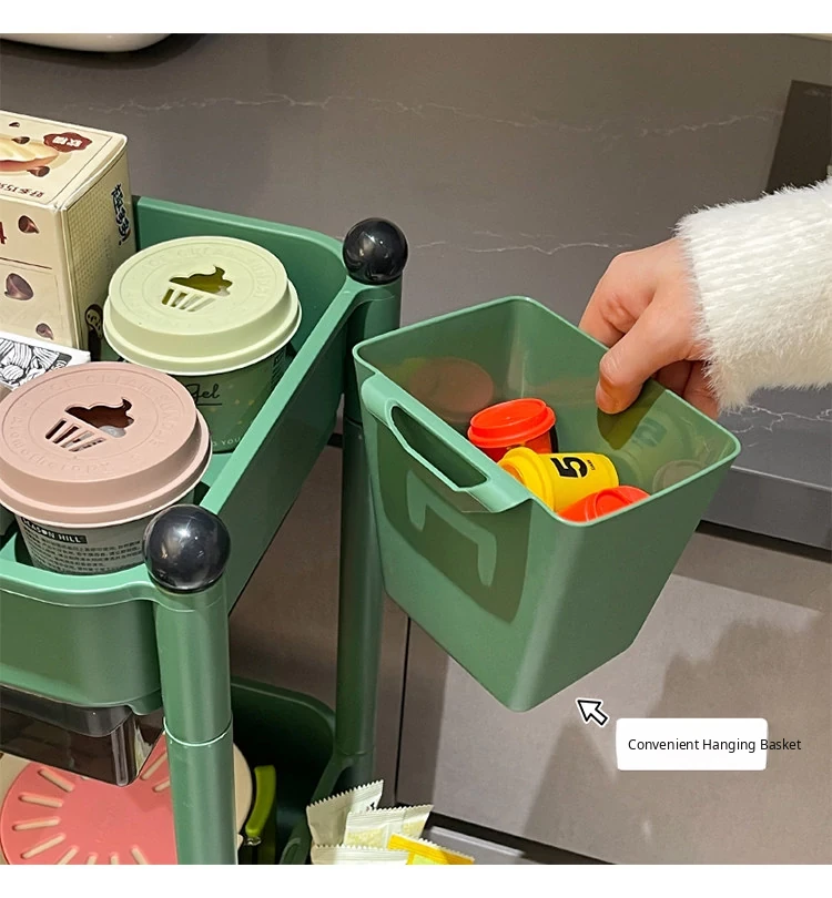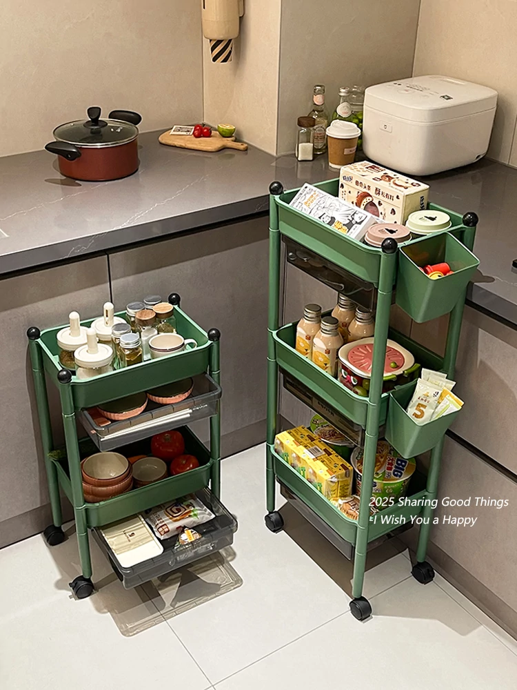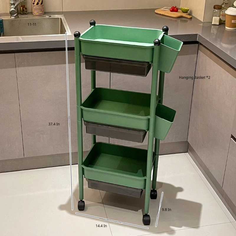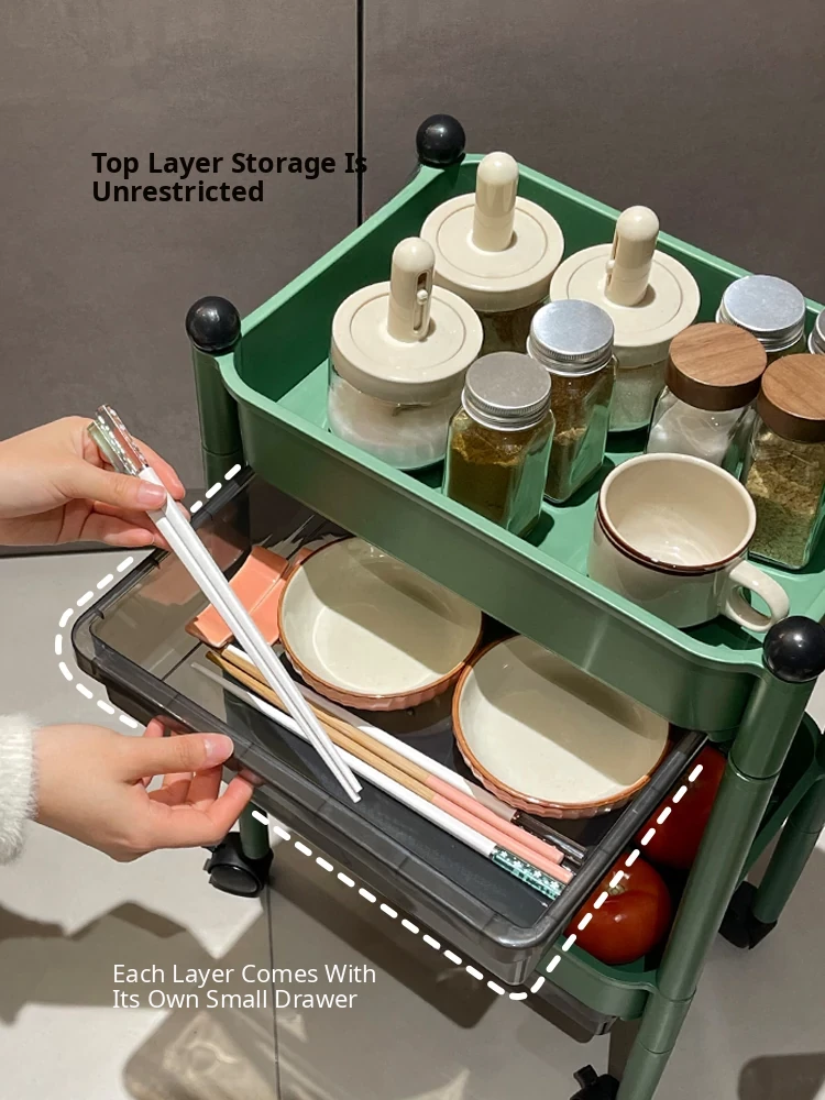 Multi-Tier Kitchen Trolley Storage Rack with Drawers and Hanging Baskets - Mobile, Spacious Organizer for Spices and Snacks, Perfect for Small Spaces!