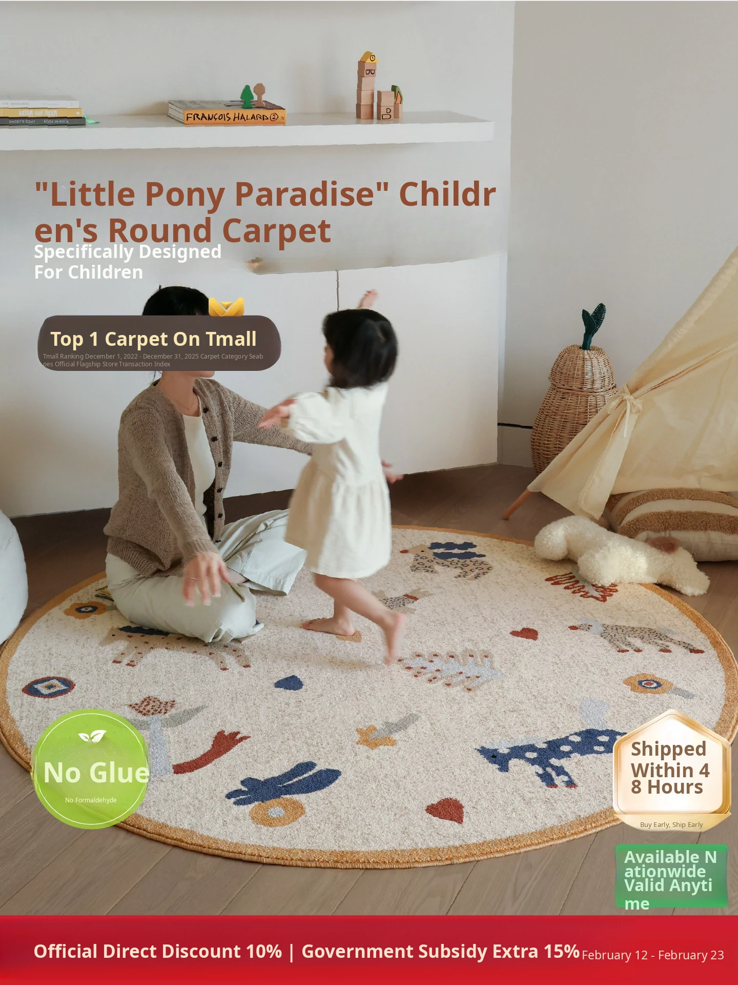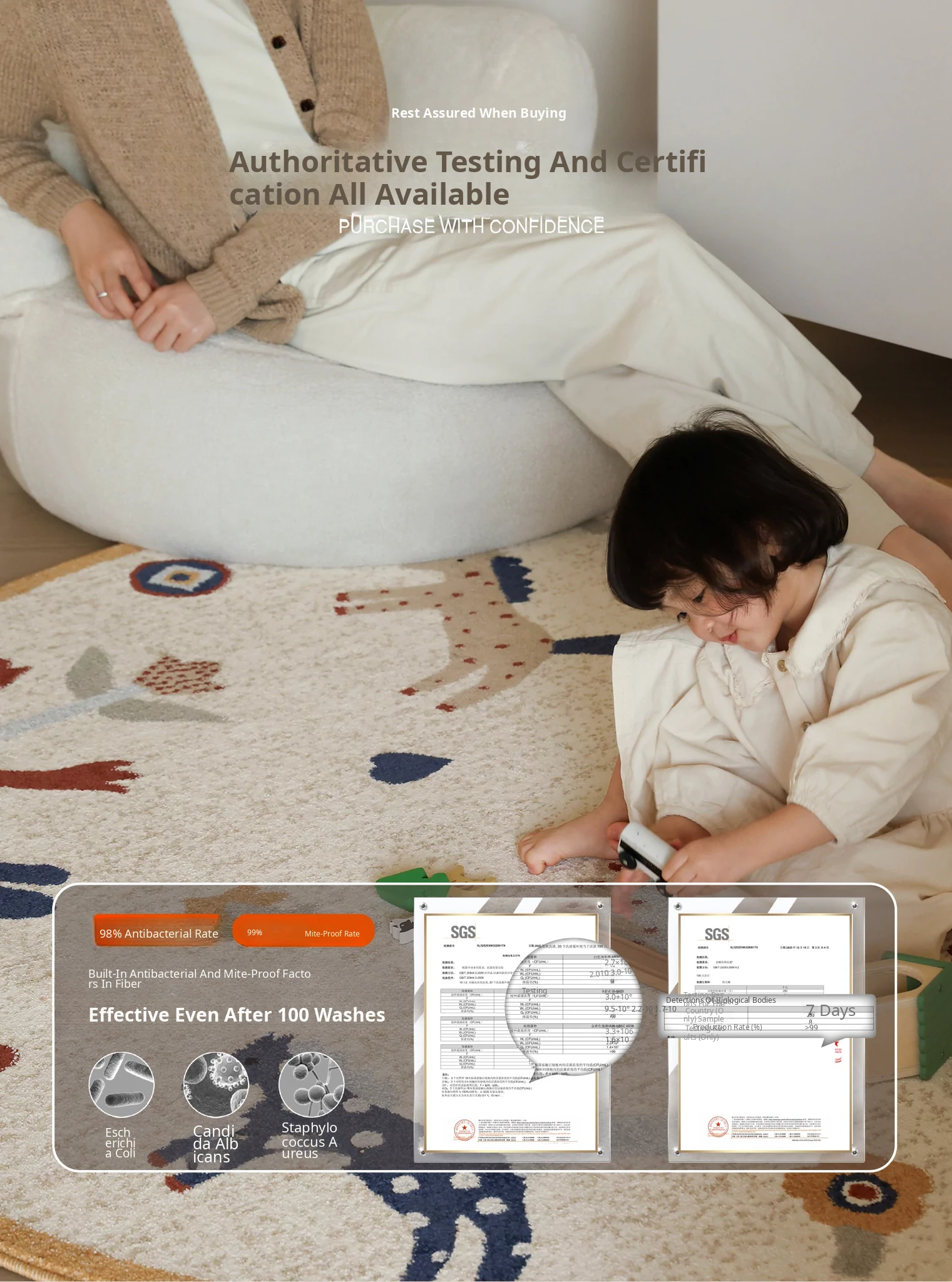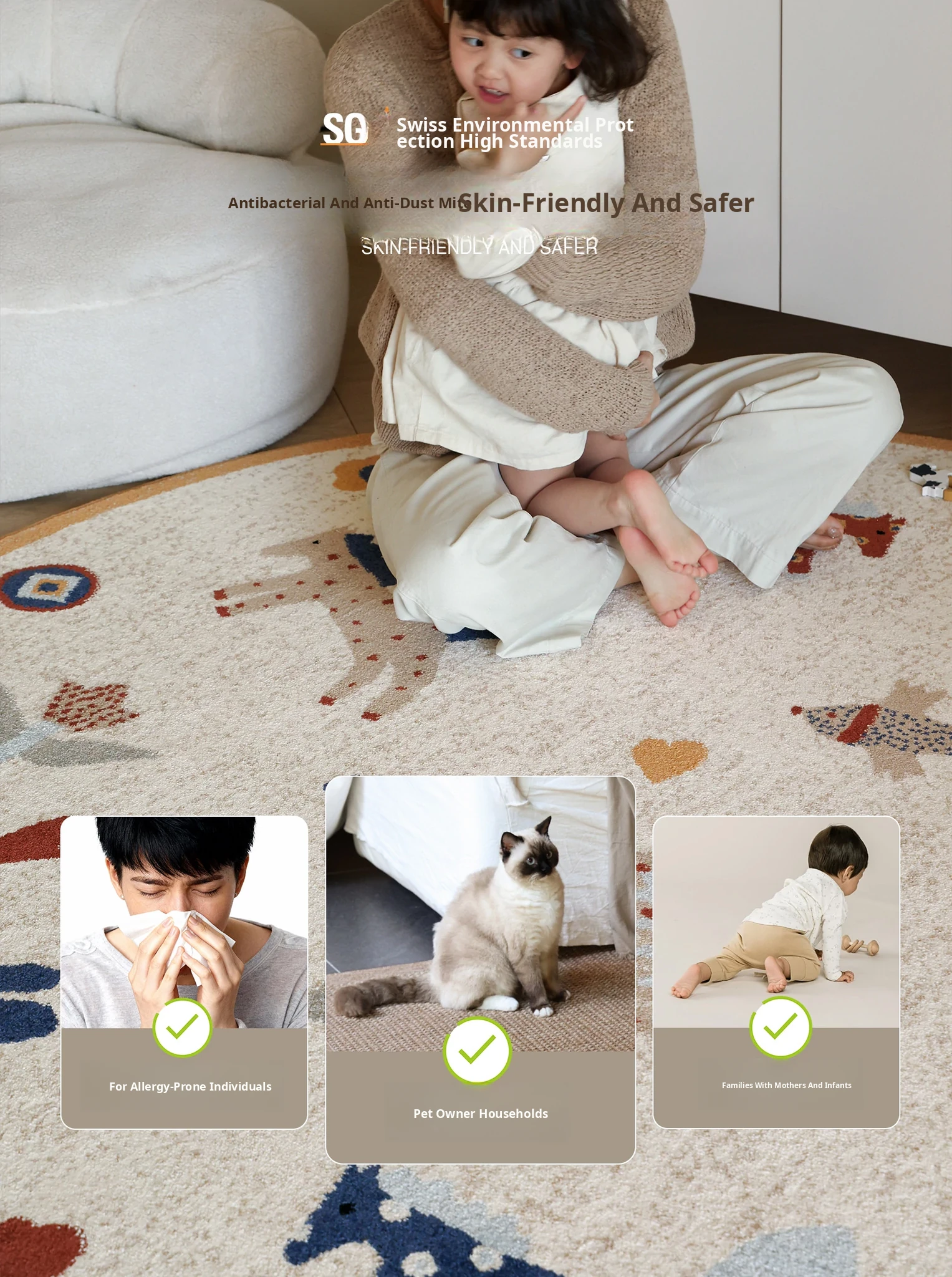 Seaboss Non-Adhesive Round Carpet for Kids - Antibacterial, Washable Bedroom and Nursery Rug, Perfect for Playtime - New 2026 Collection