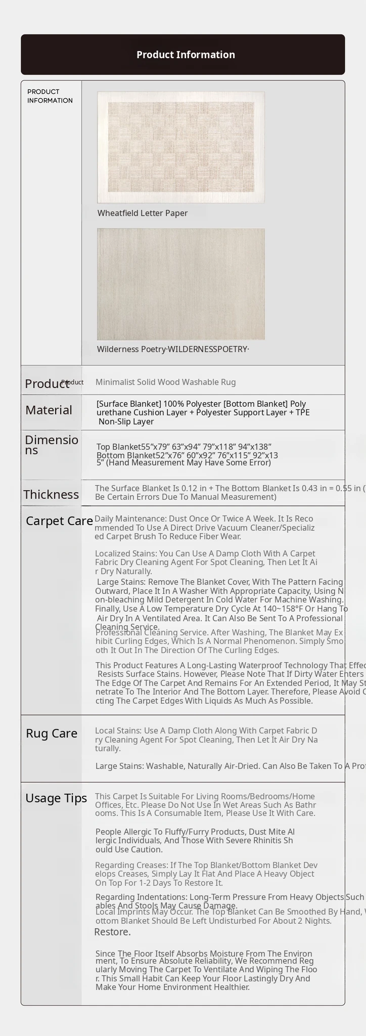140×78.74in (Carpet Surface + 0.43in Carpet Base)