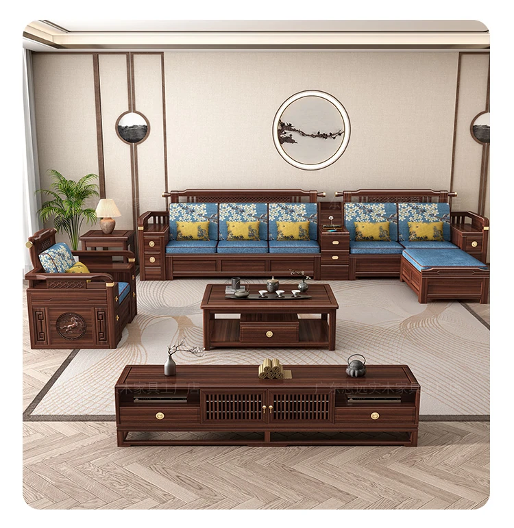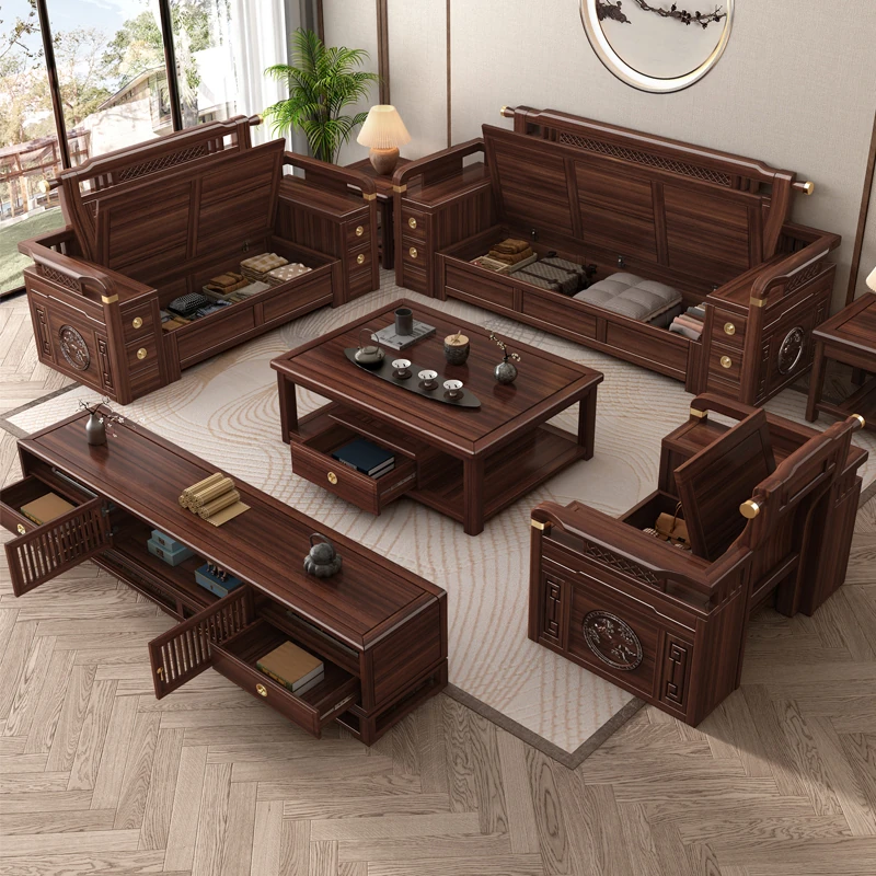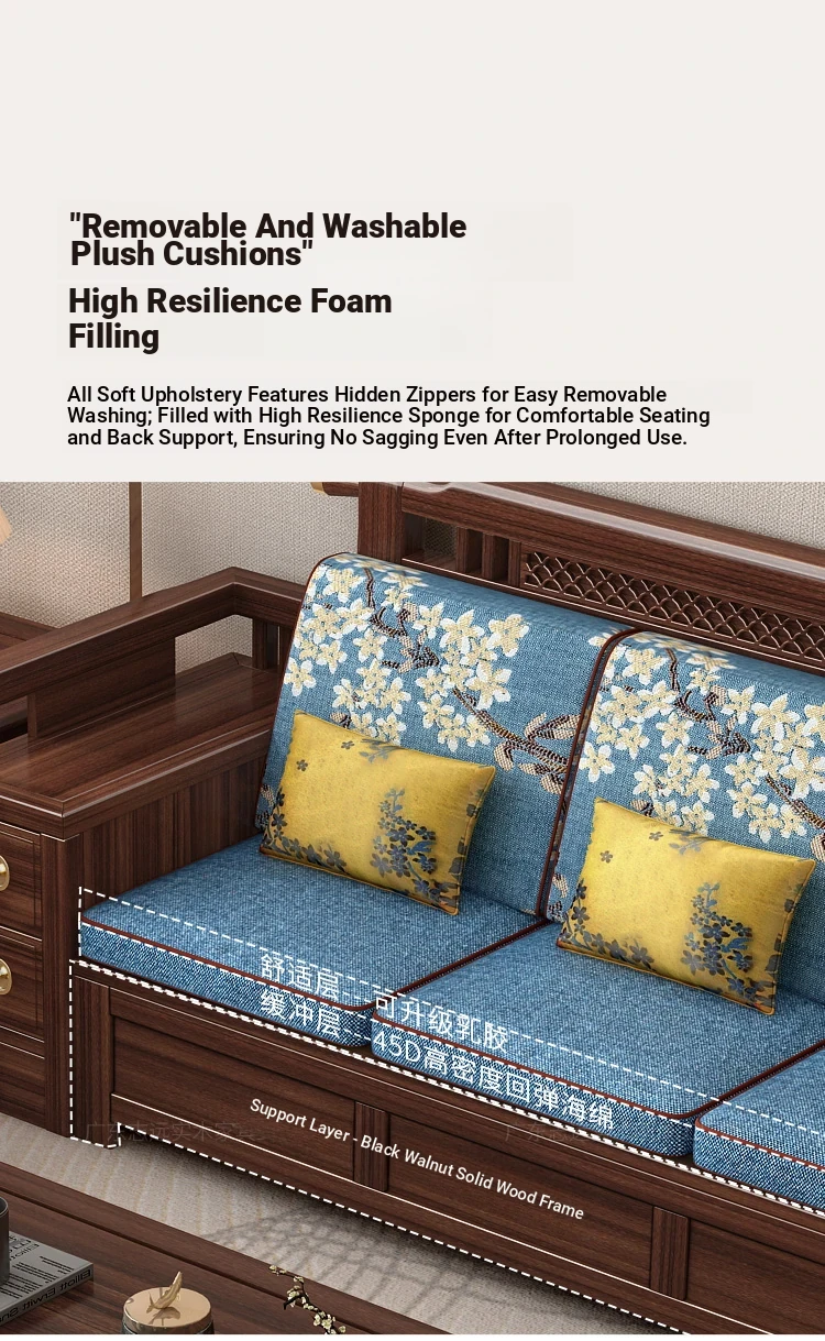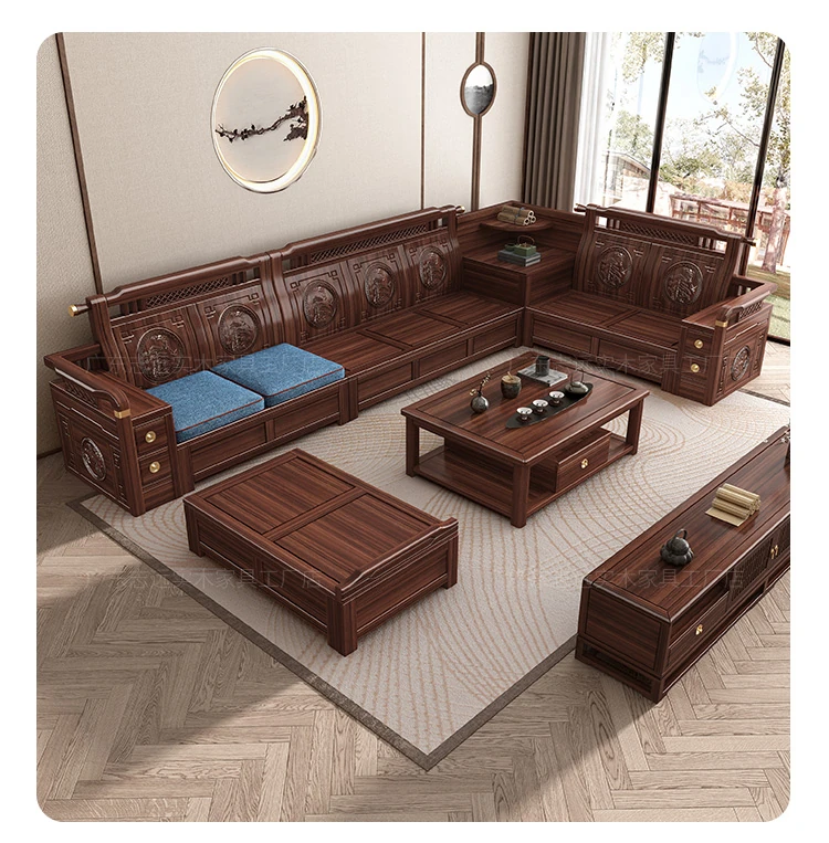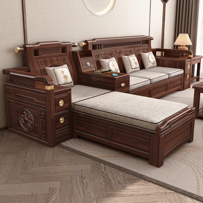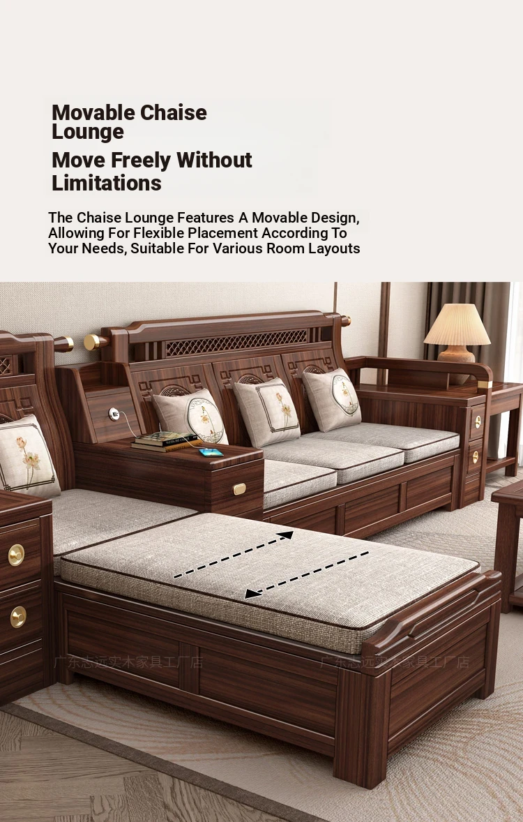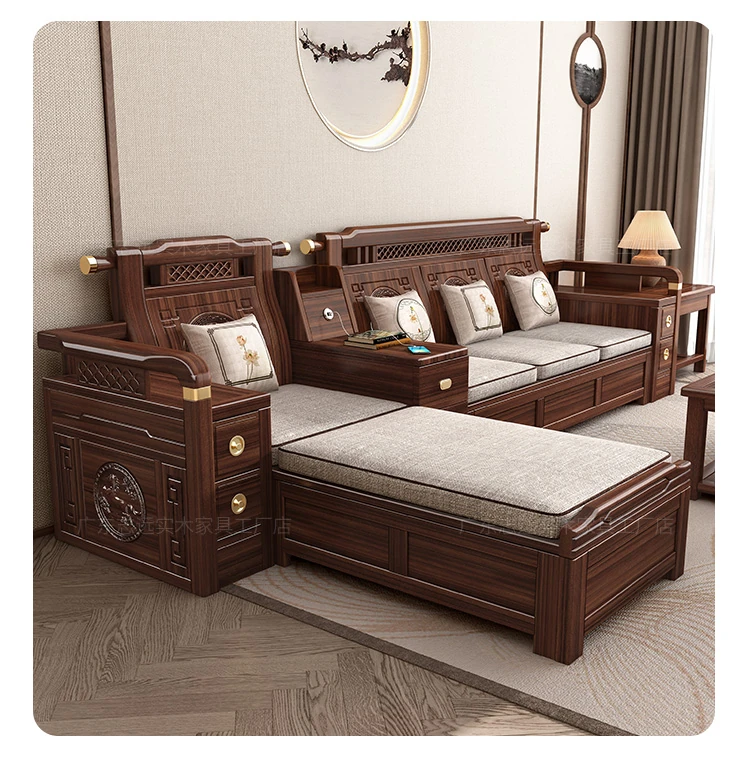 Solid Walnut Wood Sofa with Corner Chaise - Versatile for Summer and Winter, Featuring Storage Space - New Chinese Style Living Room Furniture