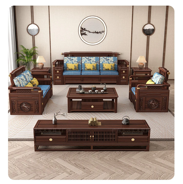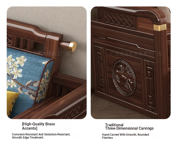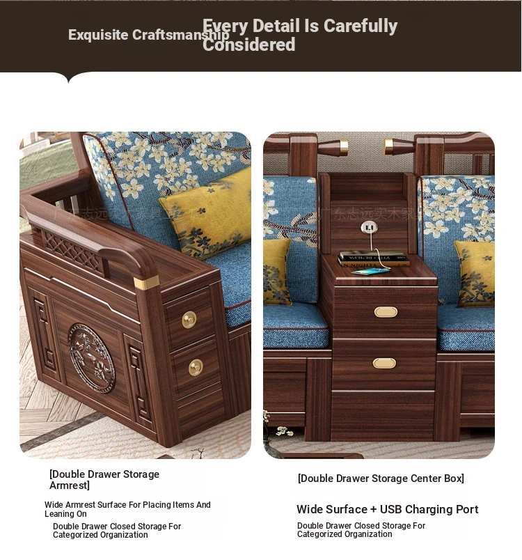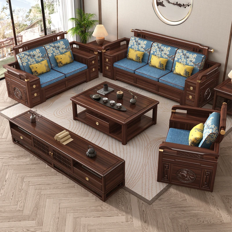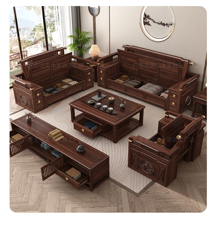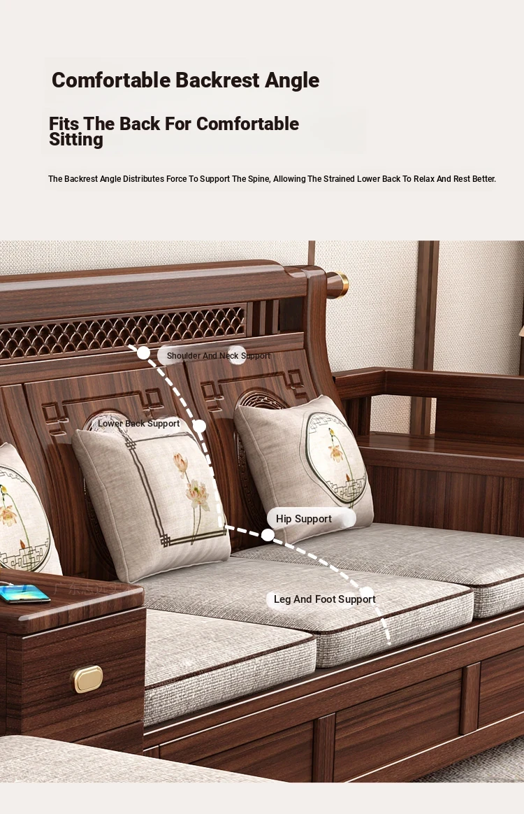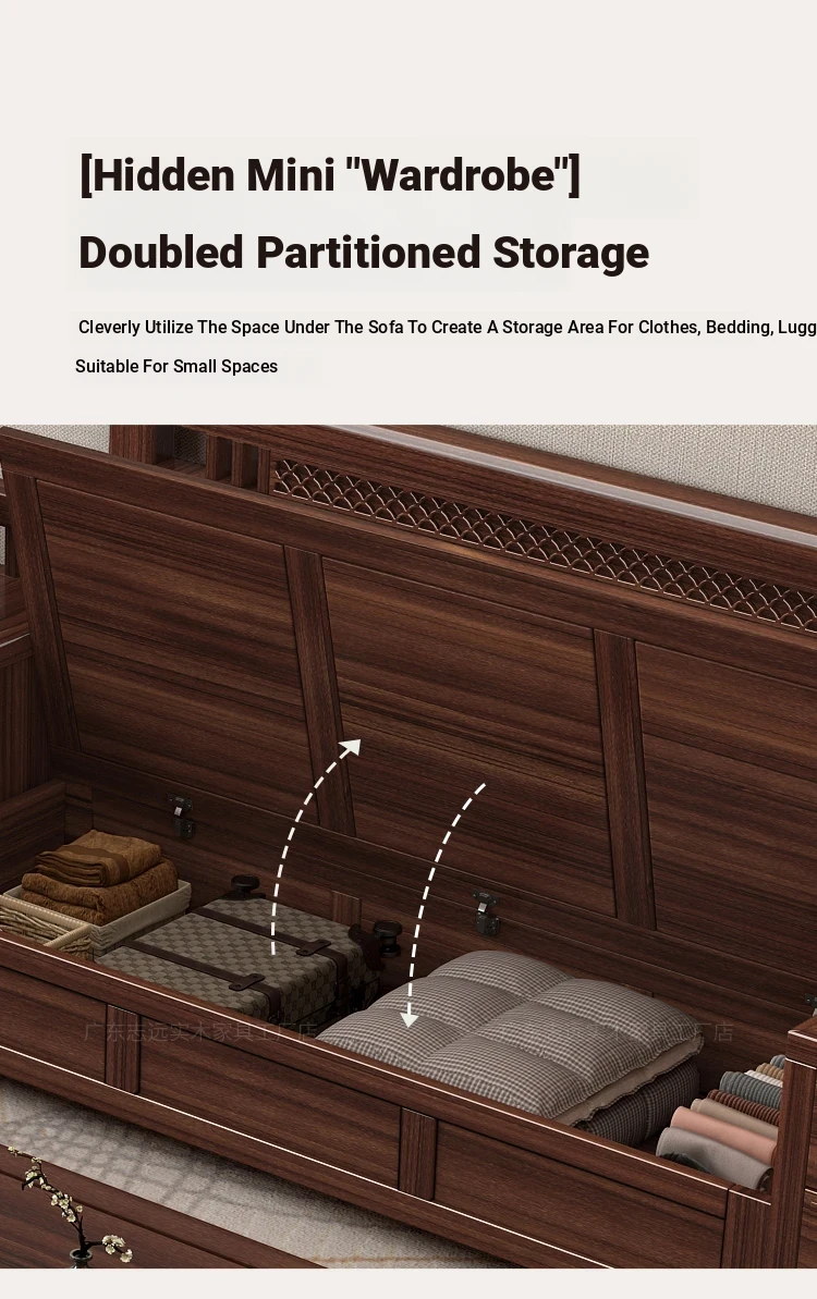 Solid Walnut Wood Sofa with Corner Chaise - Versatile for Summer and Winter, Featuring Storage Space - New Chinese Style Living Room Furniture