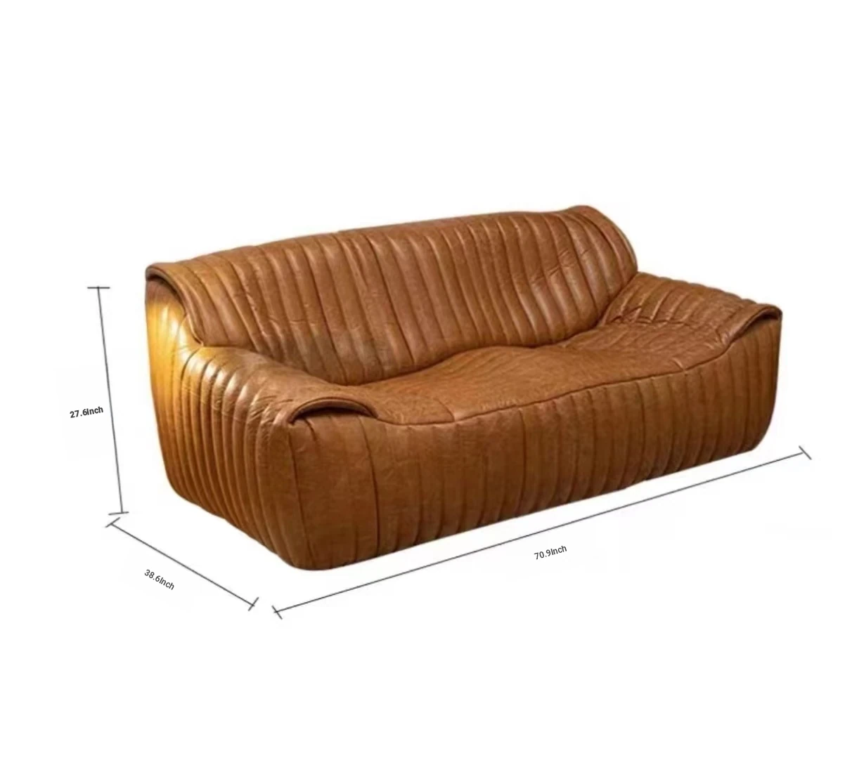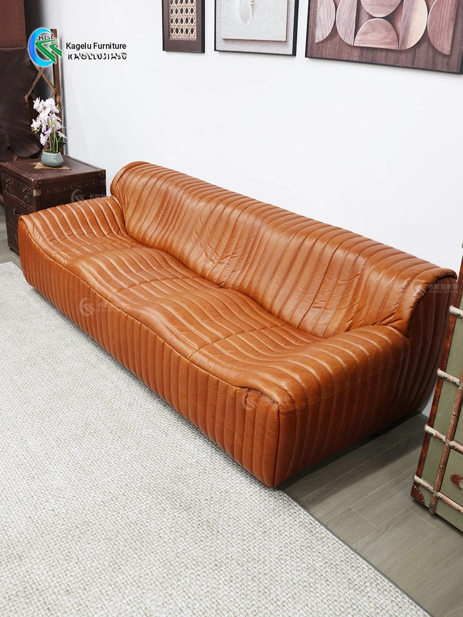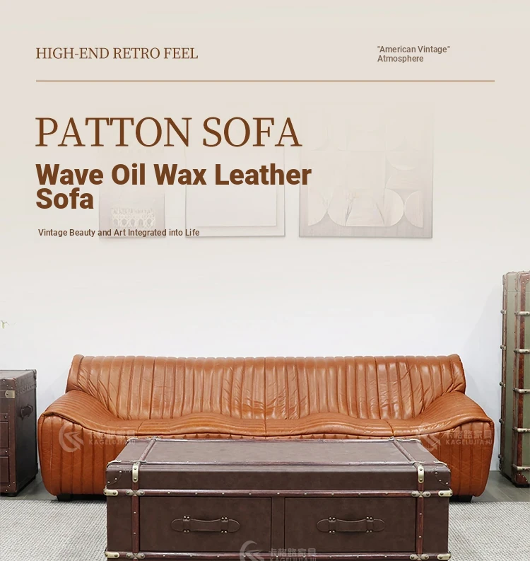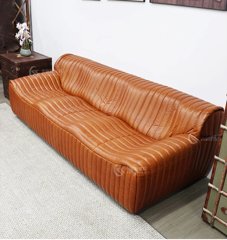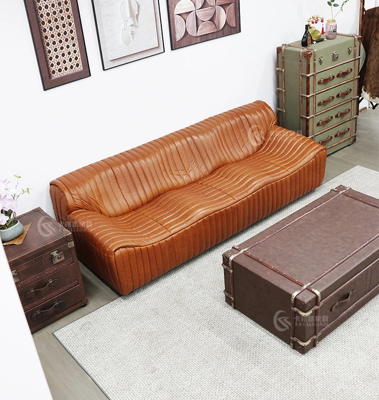 Vintage Leather Sofa - American Waxed Leather Designer Three-Seater with Wave Design - Retro Style Genuine Leather Couch for a Timeless Living Room Experience