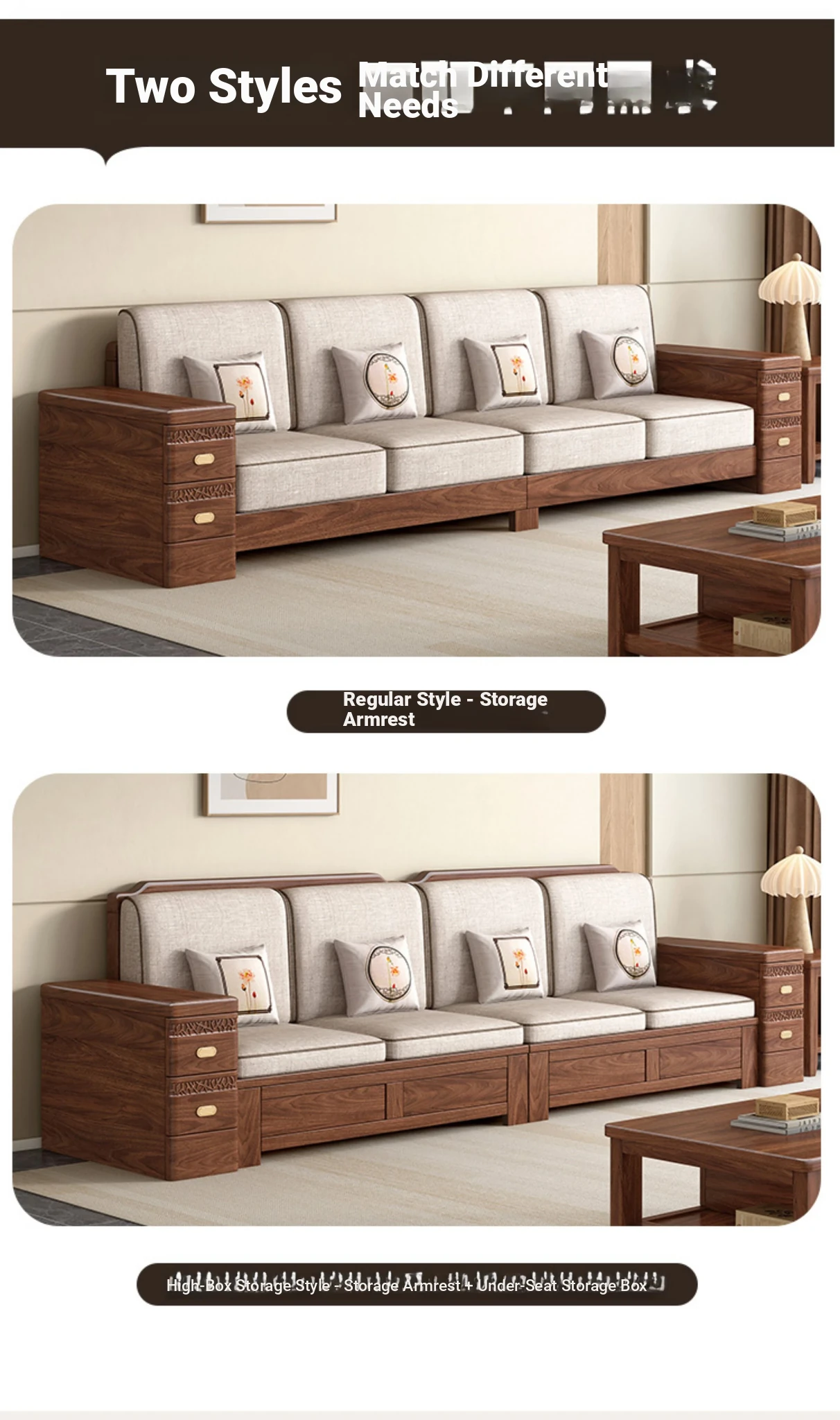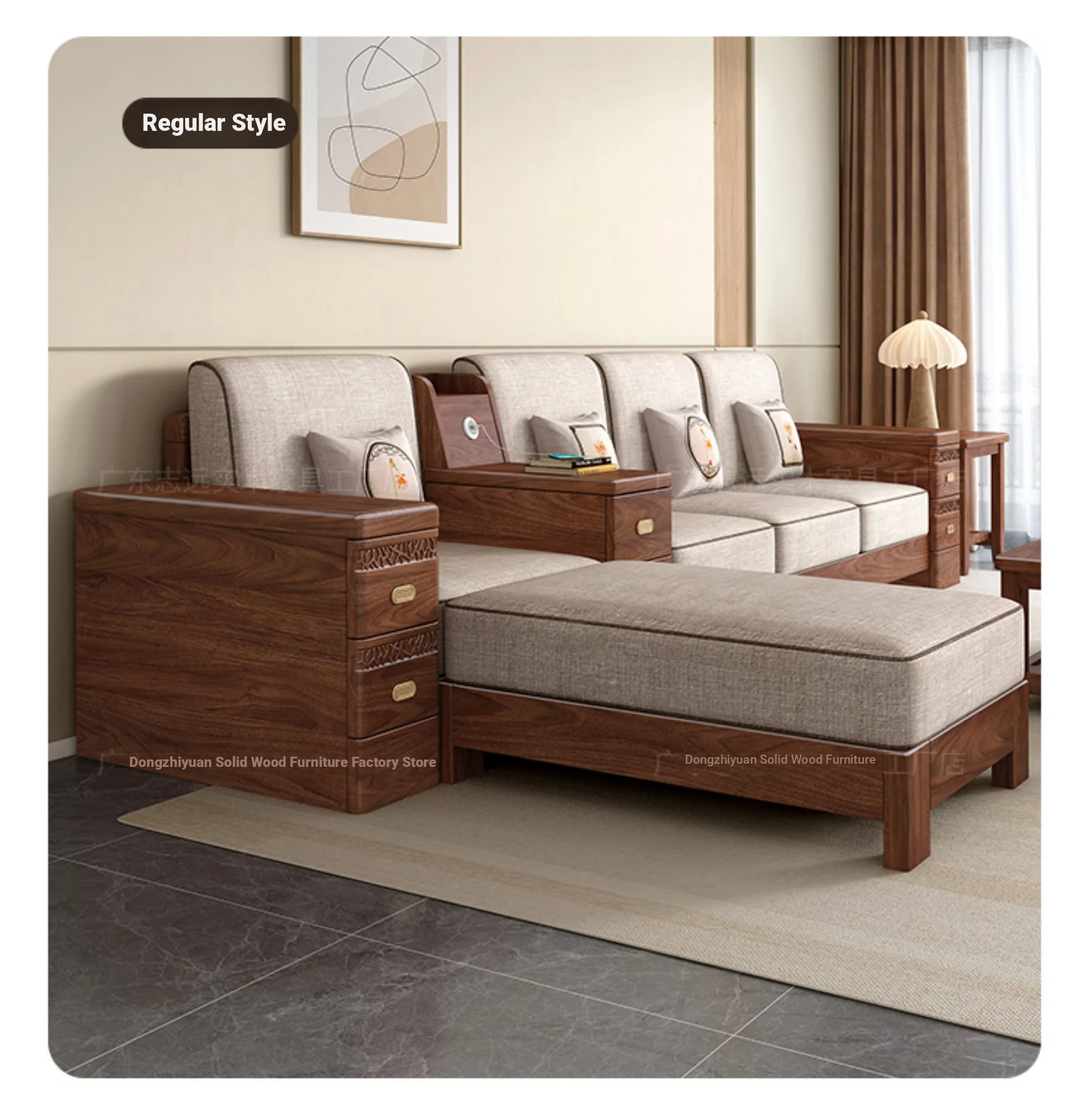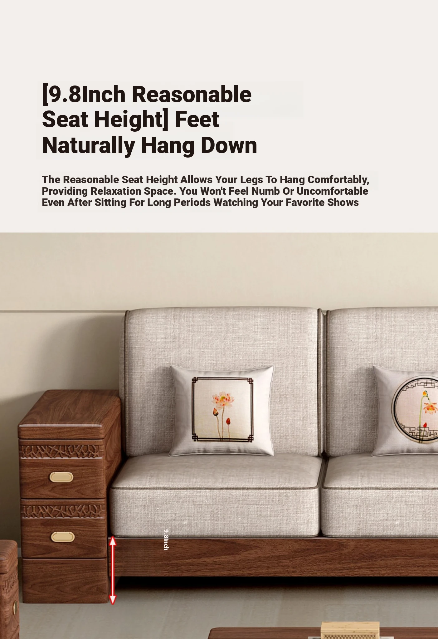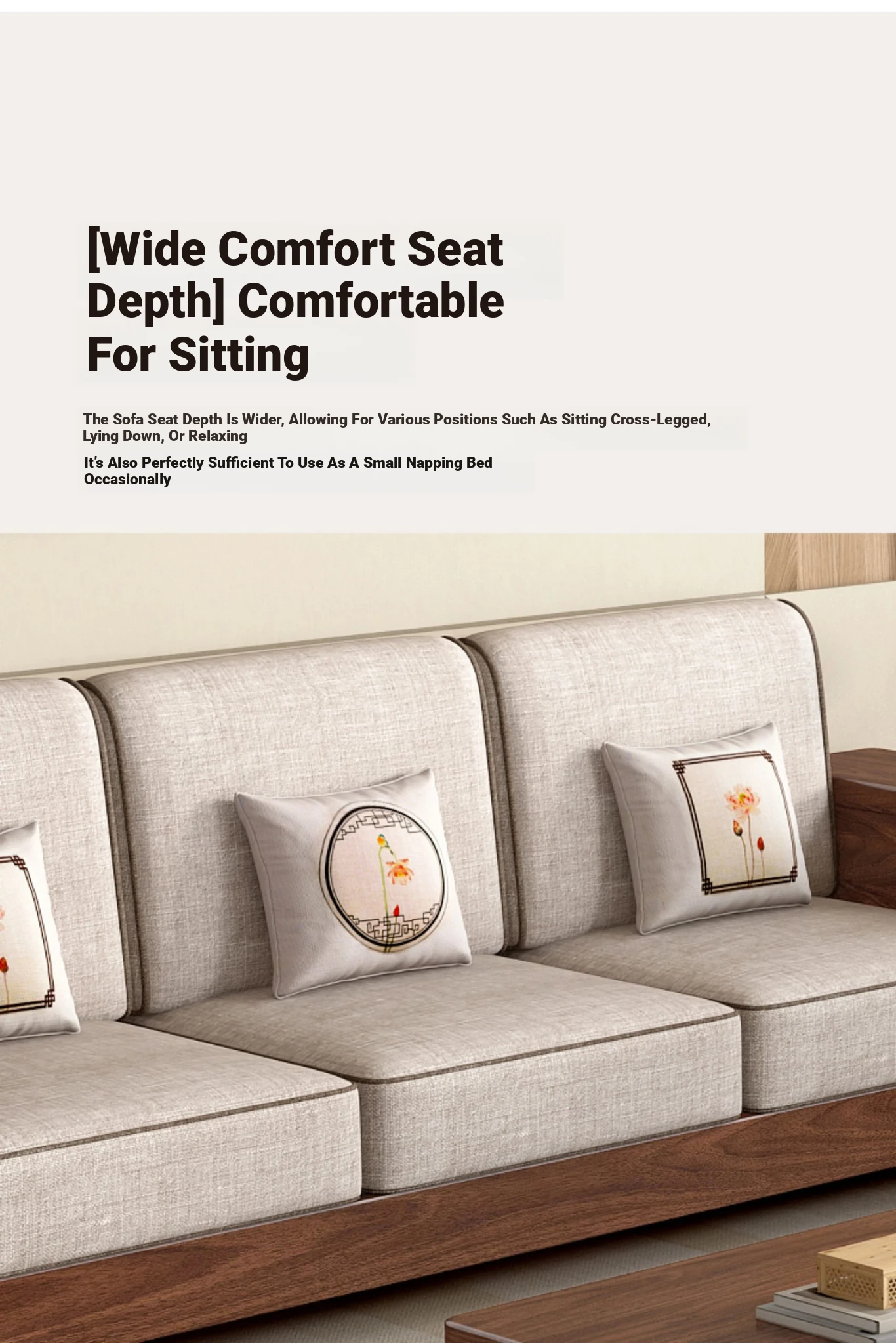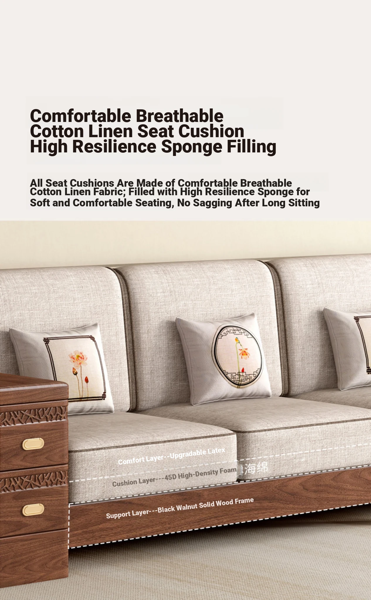 Zhi Yuan Furniture New Chinese Style Solid Wood Thick Sofa in Black Walnut - Versatile Chaise Lounge for All Seasons, Perfect for Small and Large Living Rooms