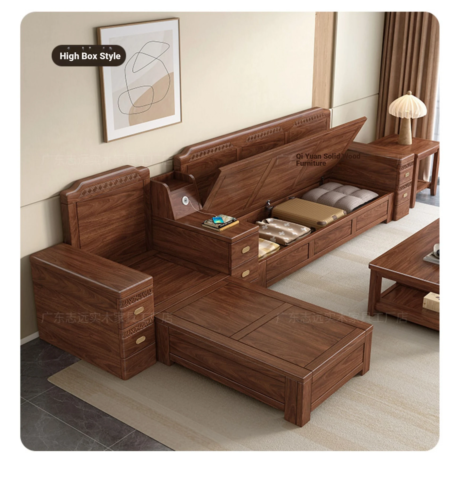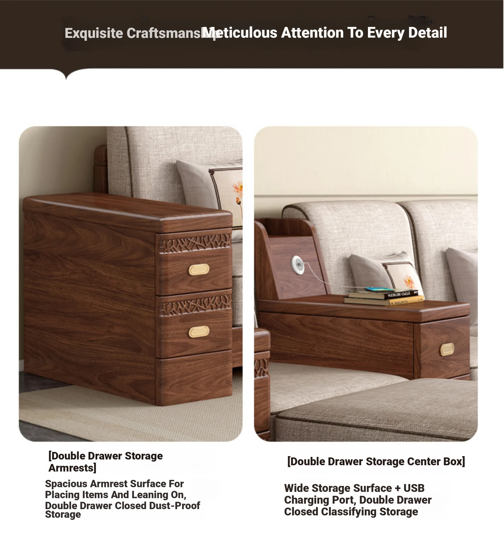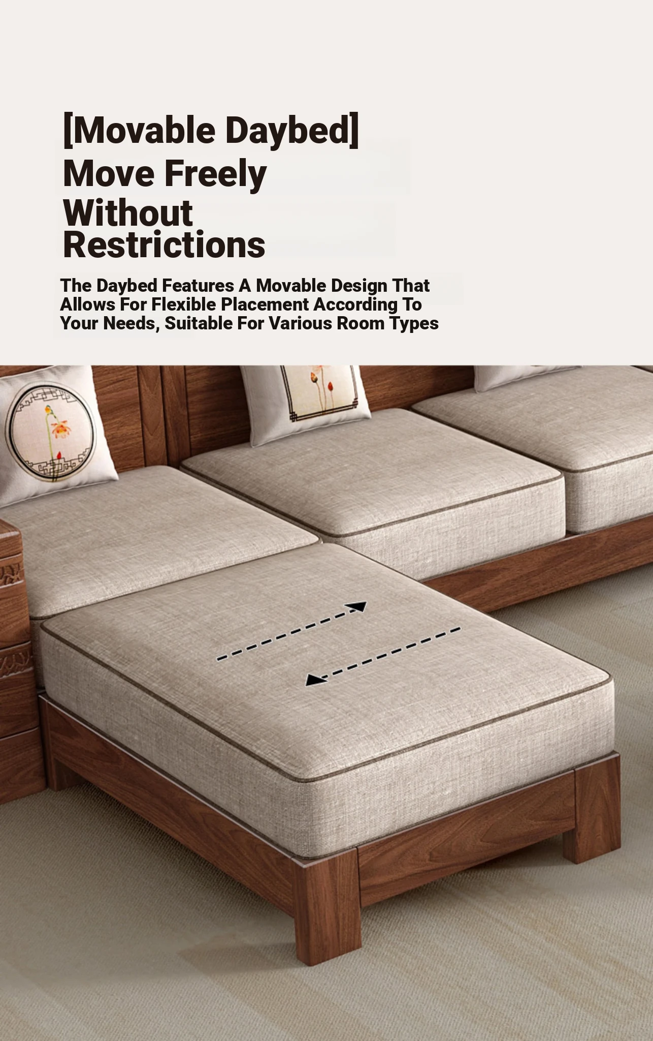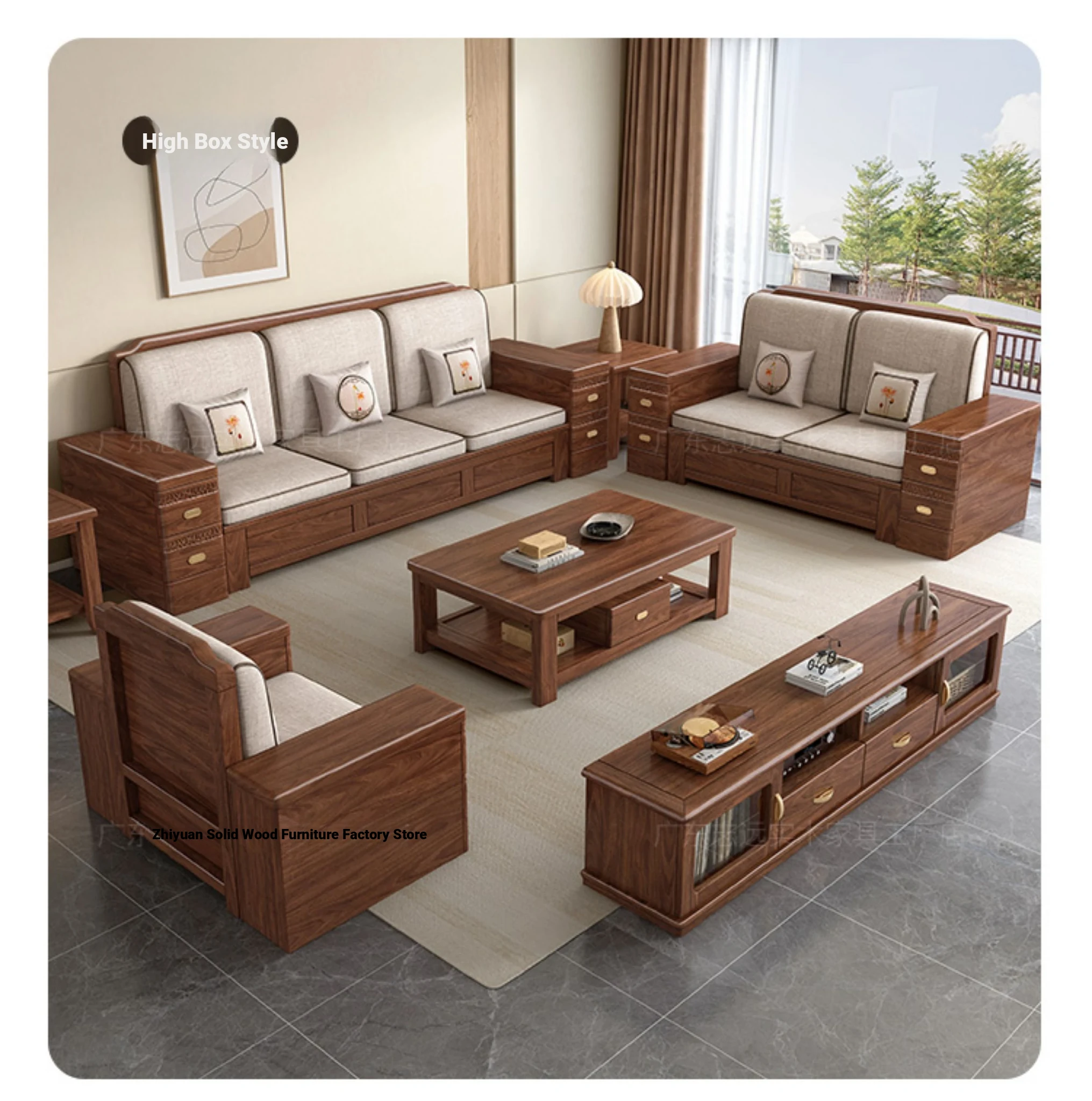 Zhi Yuan Furniture New Chinese Style Solid Wood Thick Sofa in Black Walnut - Versatile Chaise Lounge for All Seasons, Perfect for Small and Large Living Rooms