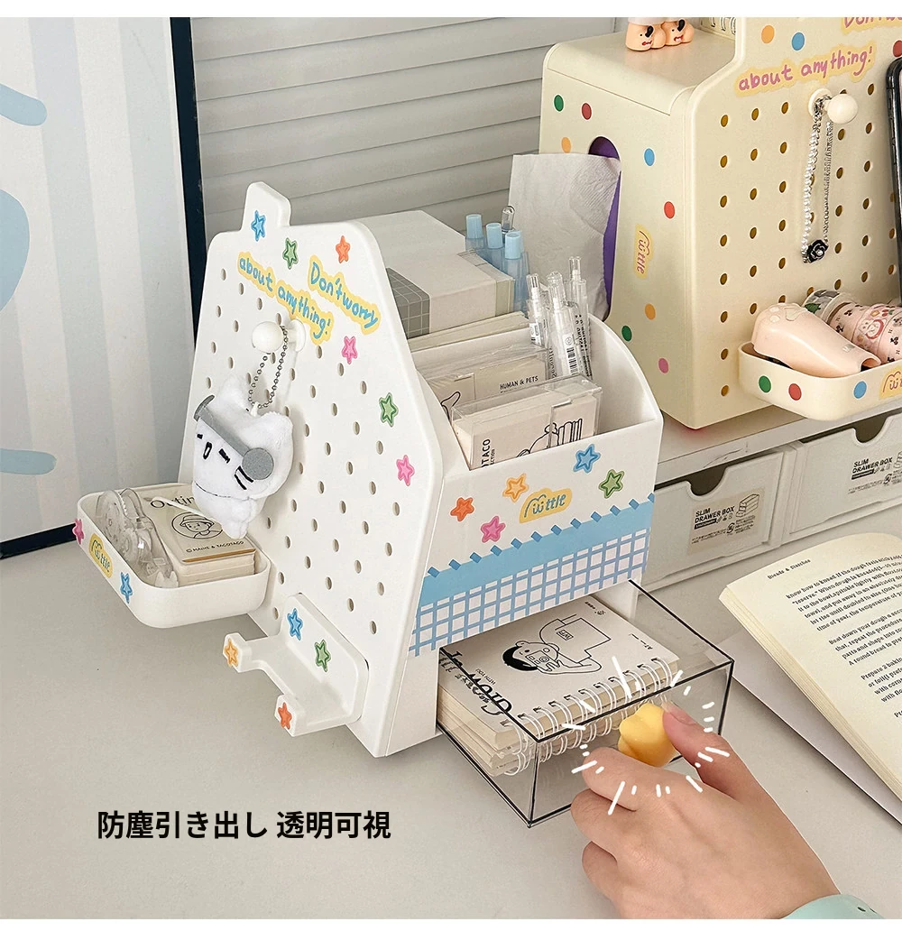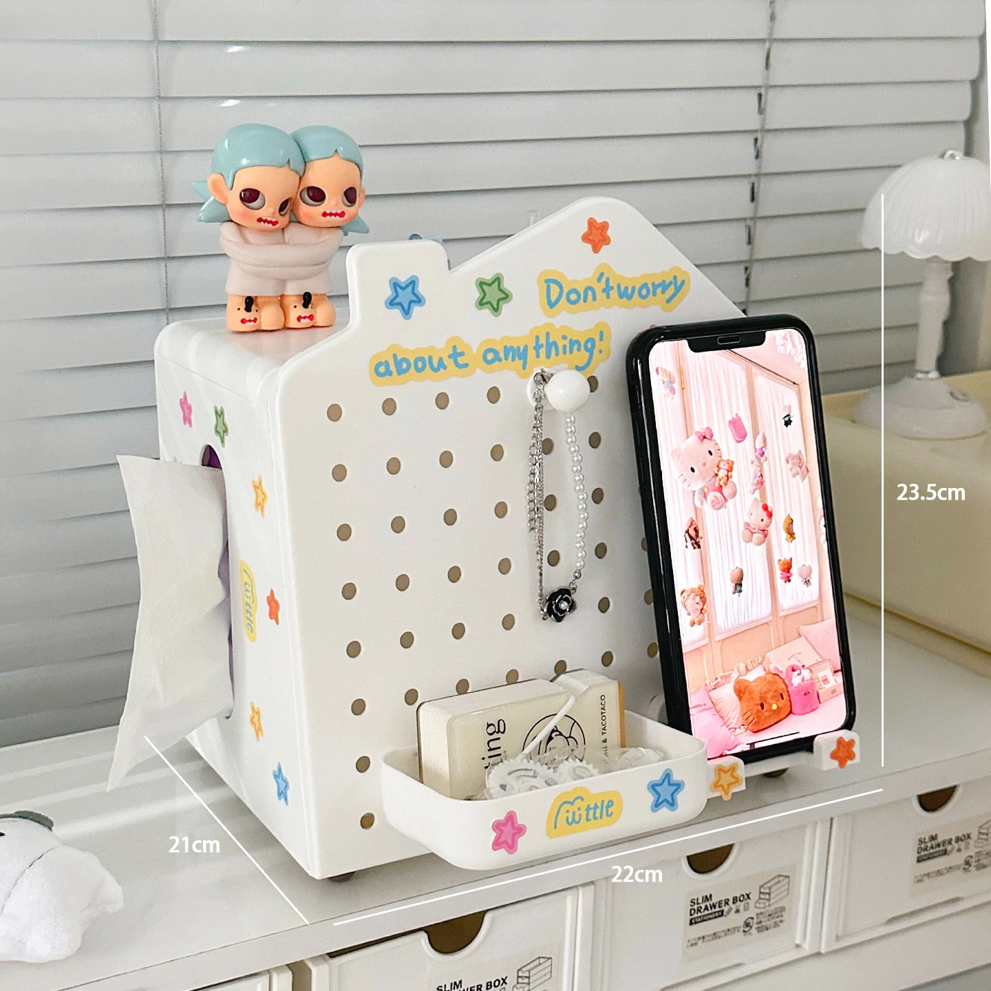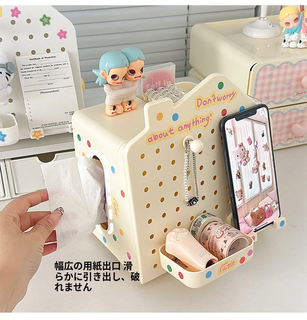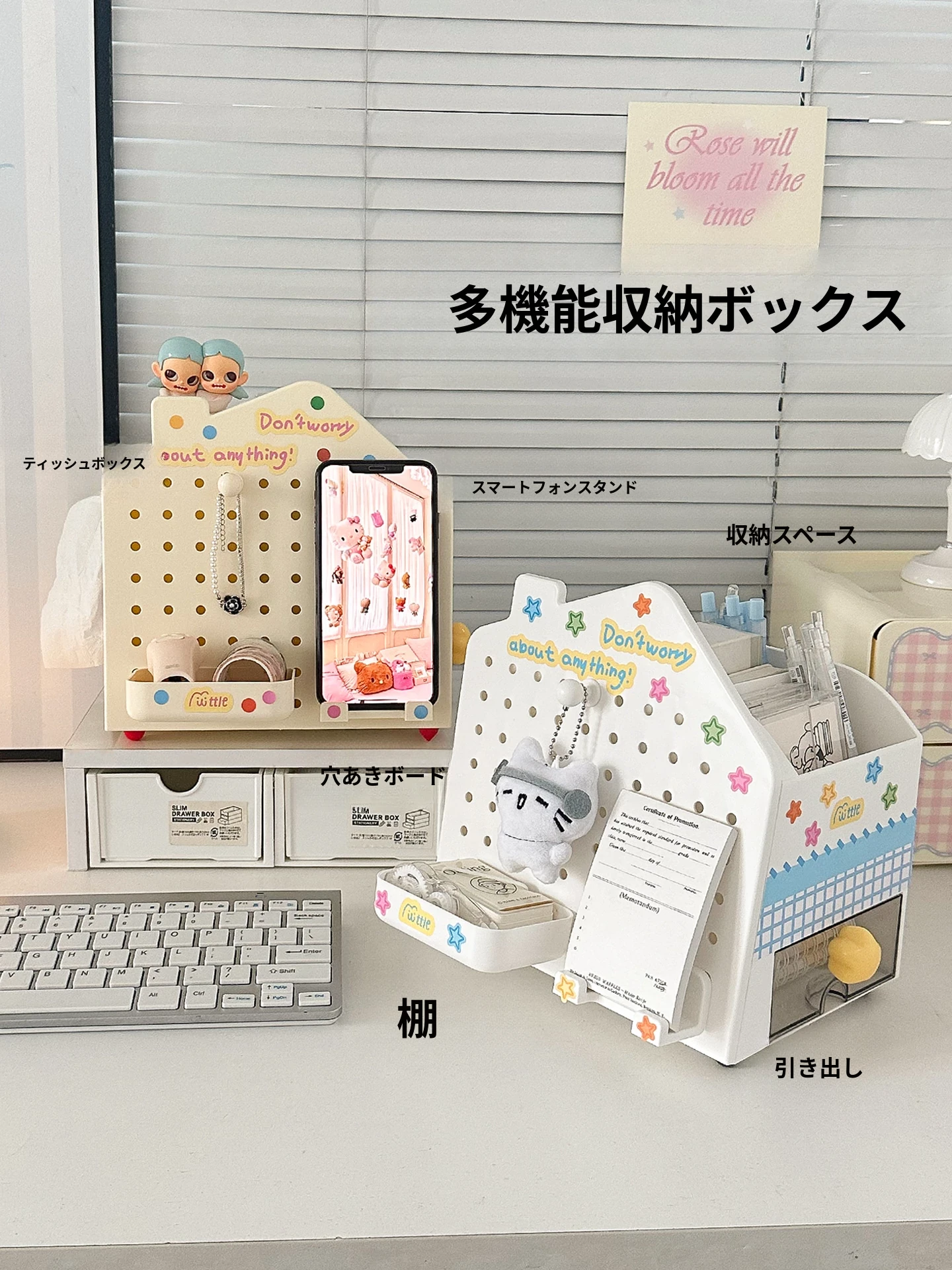 小さな家のデスク用穴あき収納ボックス - ティッシュボックス&スマホスタンド機能付き!多用途文房具&雑貨整理棚で、デスクをすっきり整頓!