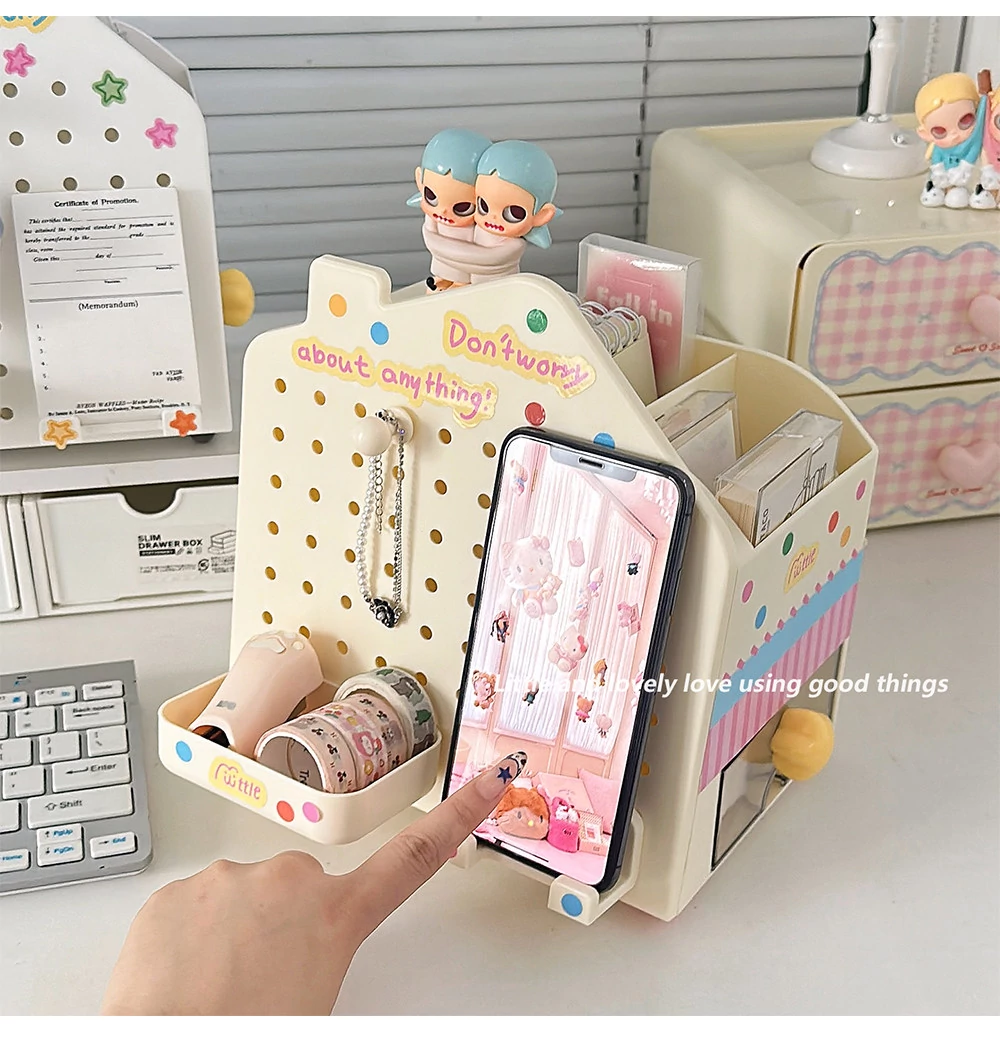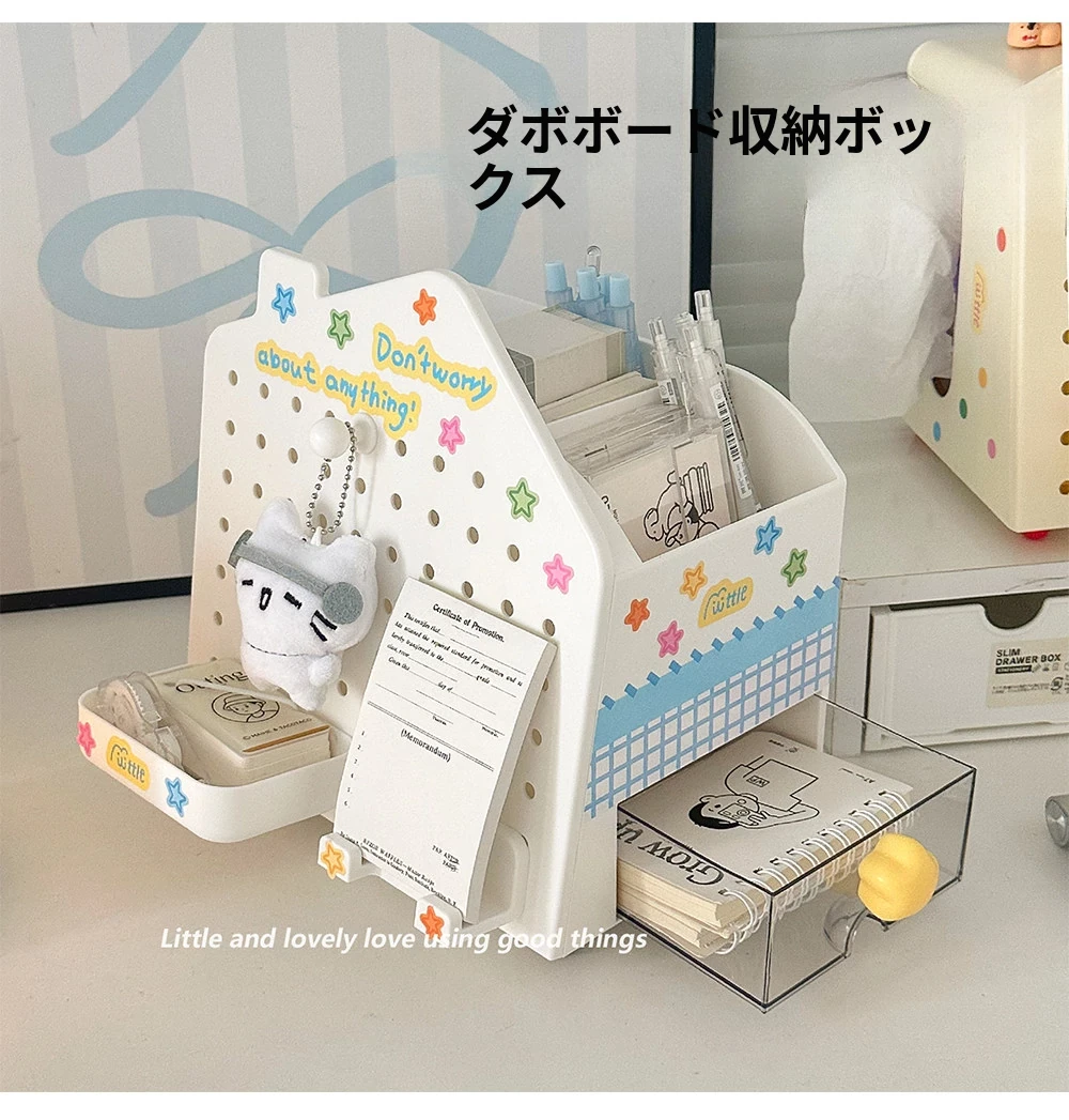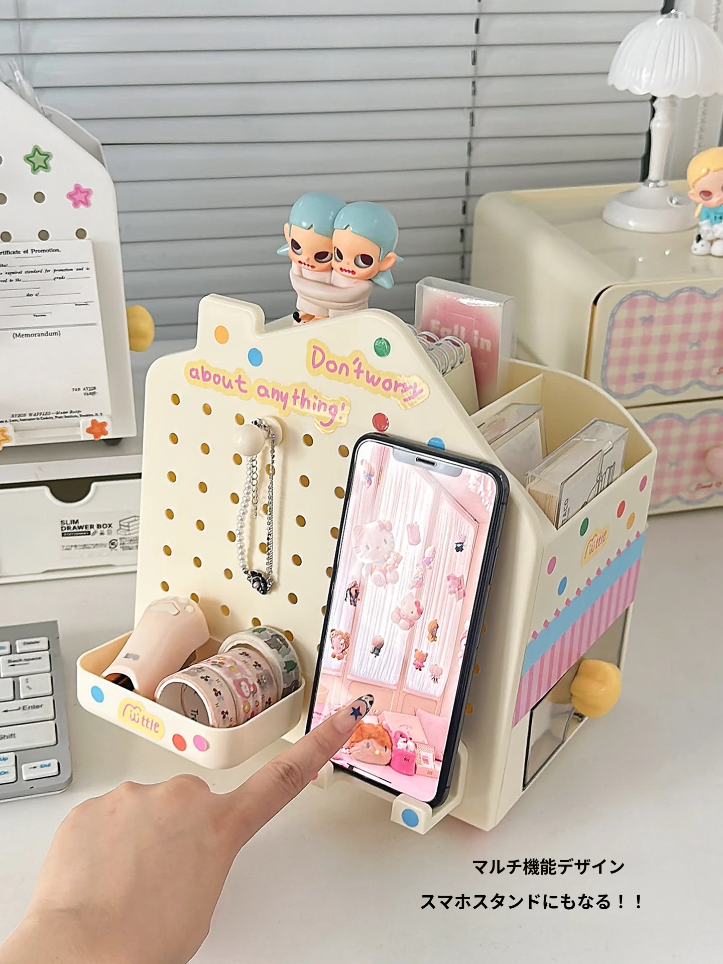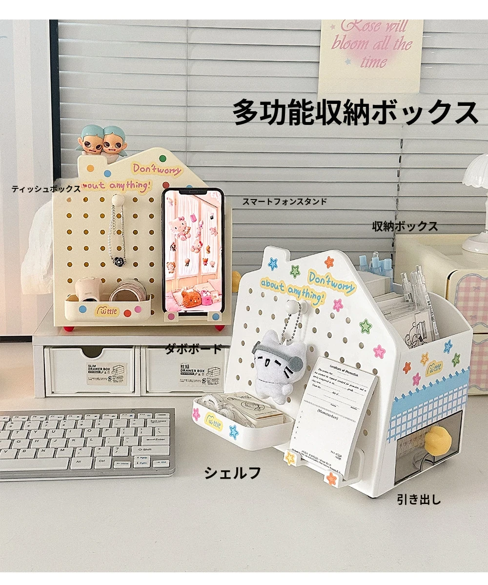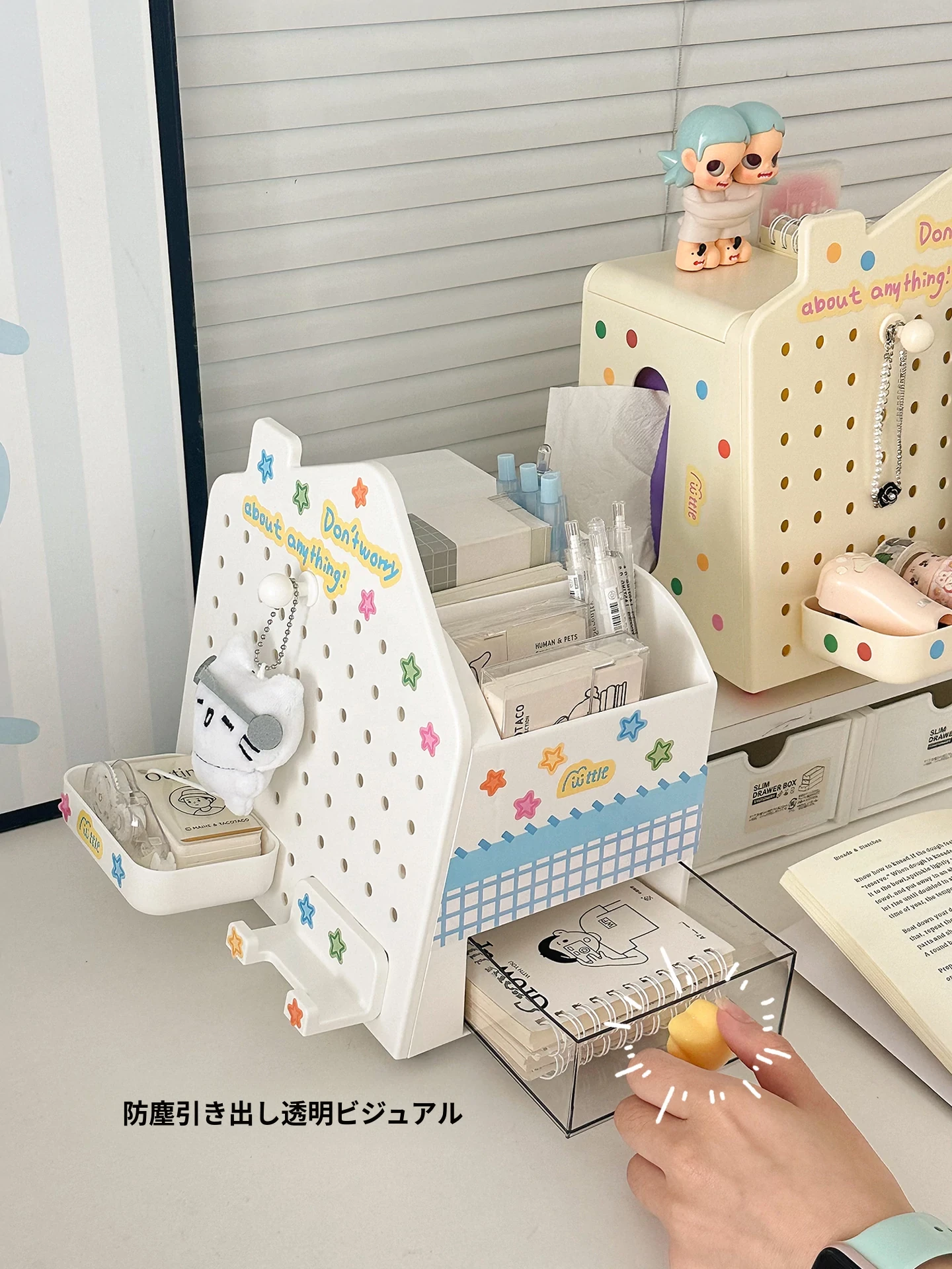 小さな家のデスク用穴あき収納ボックス - ティッシュボックス&スマホスタンド機能付き!多用途文房具&雑貨整理棚で、デスクをすっきり整頓!