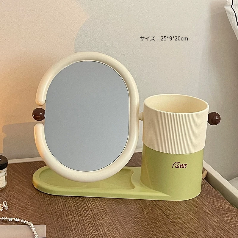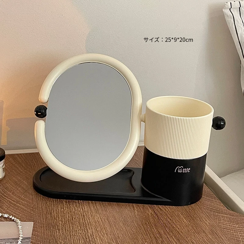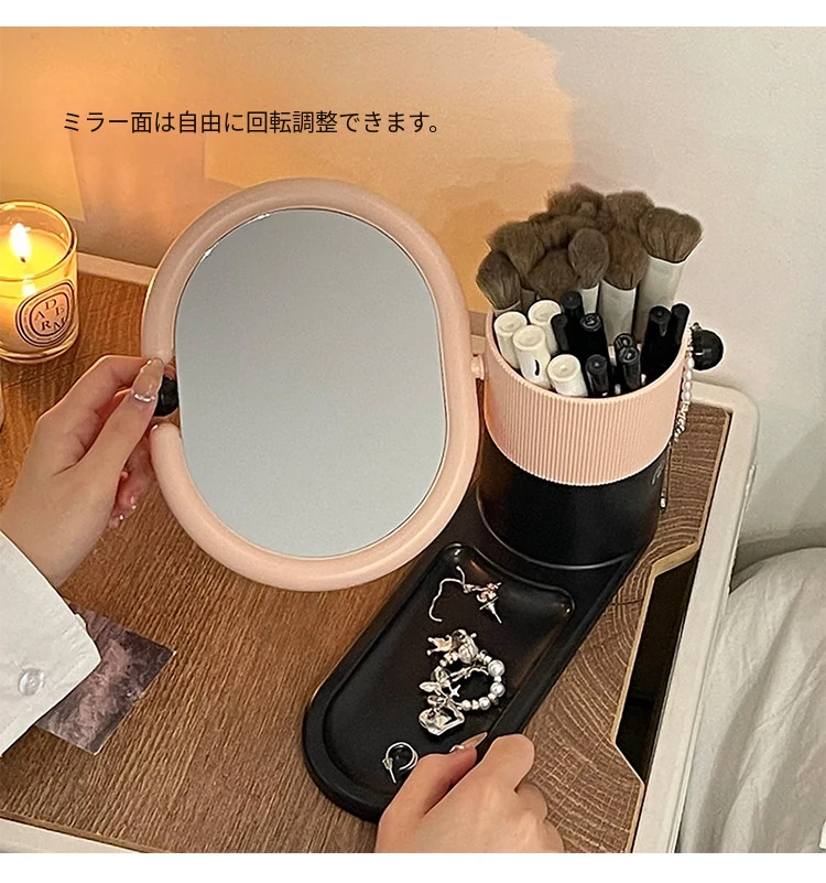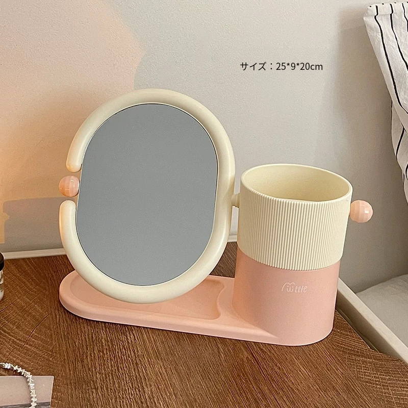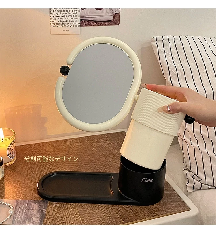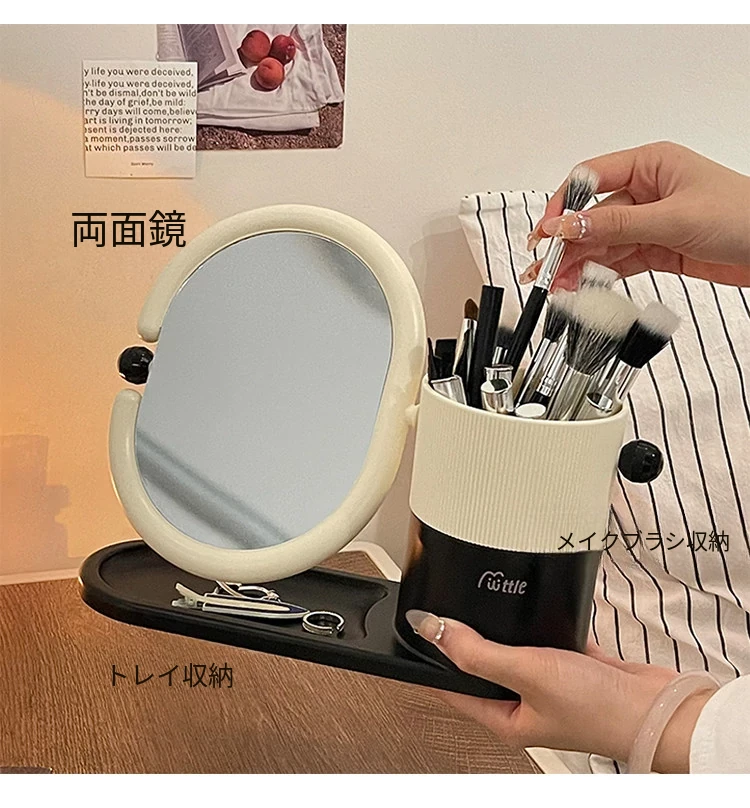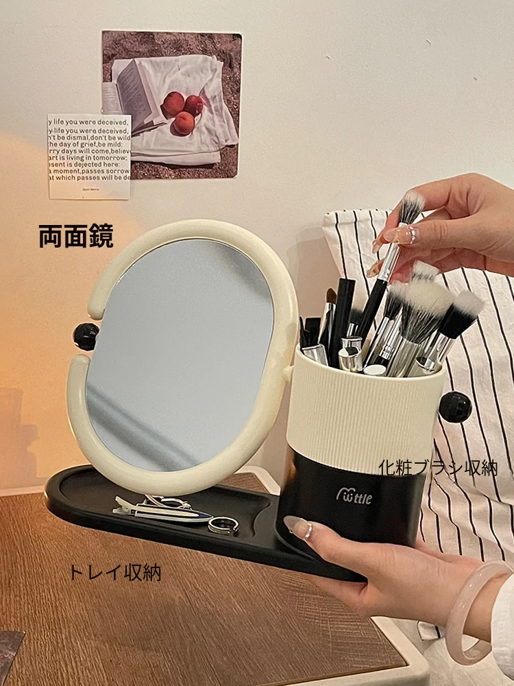 クリームカラーのメイクブラシ収納ケース+両面回転式化粧鏡!大学生の寮にぴったりなデスク整理スタンドで、スッキリとしたおしゃれ空間を実現!あなたのメイクアップを一段と楽しく!