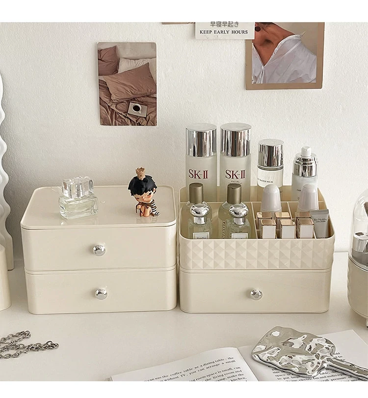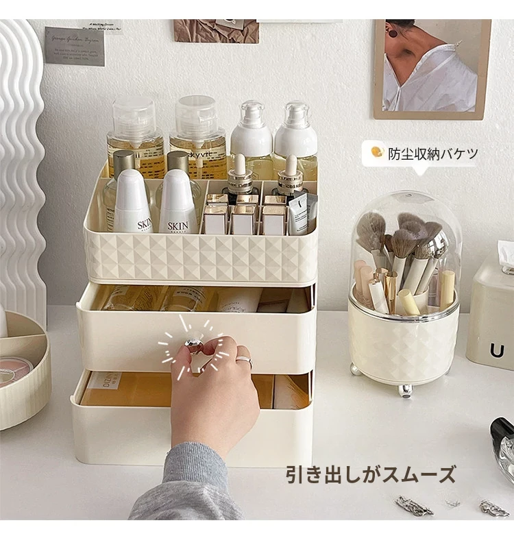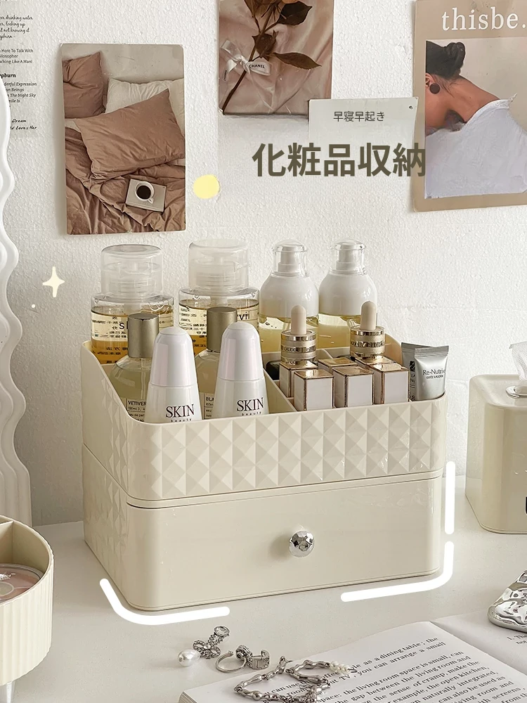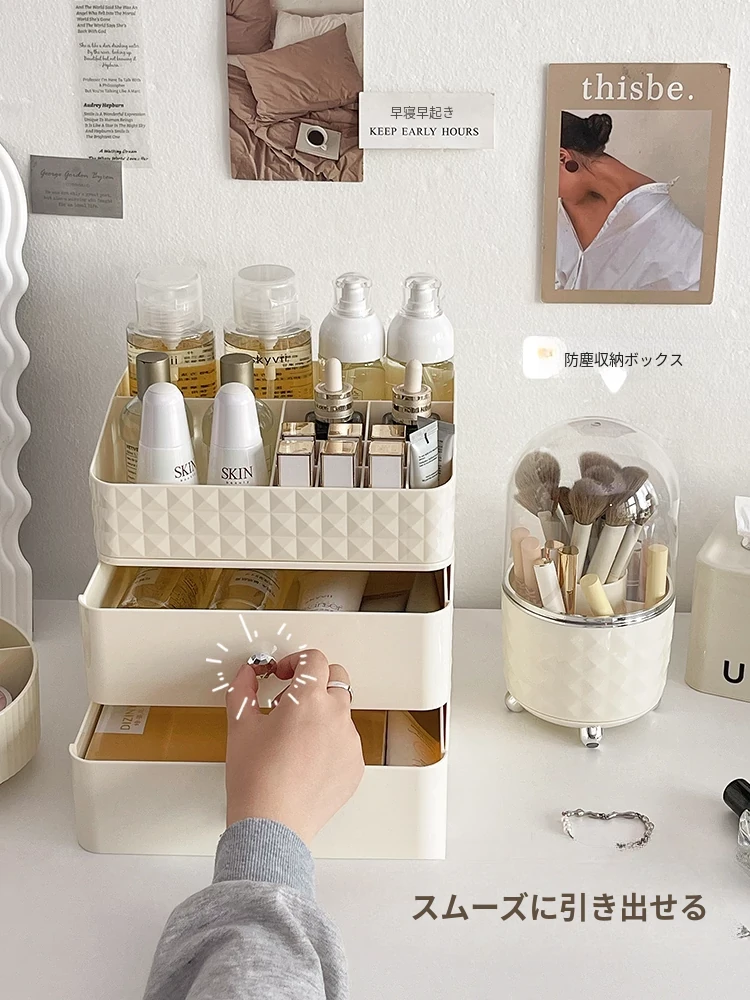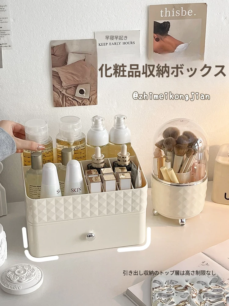 クリーム風化粧品収納ボックス デスクトップメイクブラシ引き出し式化粧台 学生寮向け スキンケアアイテム収納ラック - スタイリッシュで整理整頓が簡単、あなたの美しさを引き立てる必須アイテム!