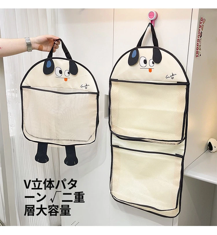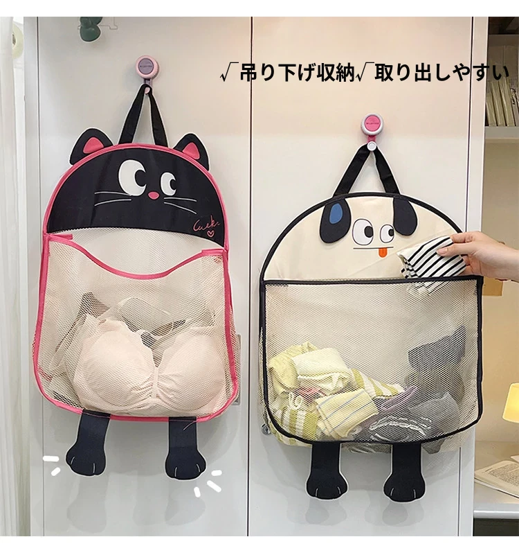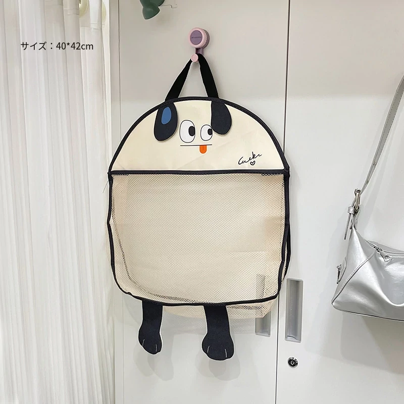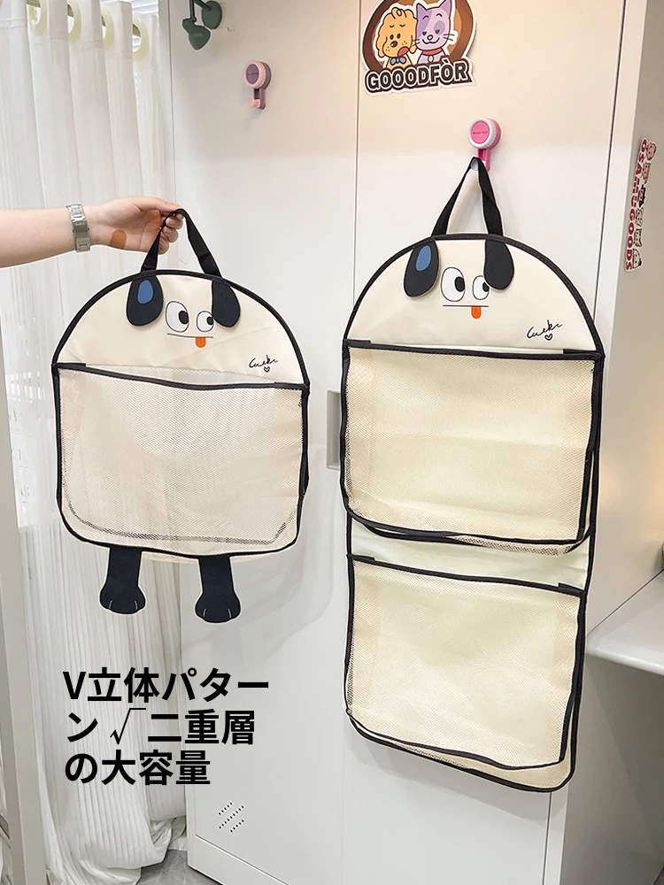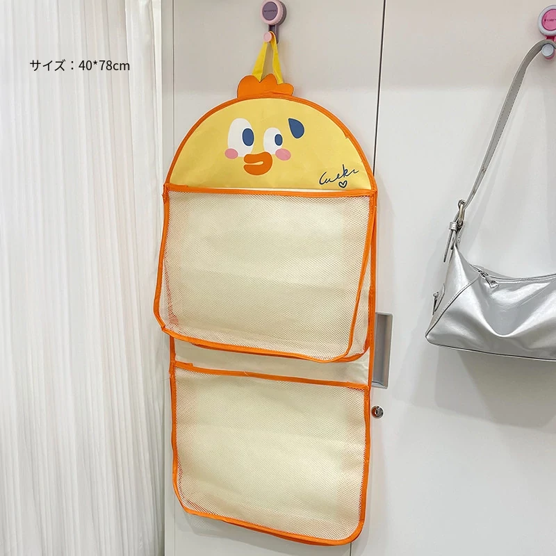 かわいいデザインの壁掛け収納ポケット - 寮生活をもっと便利に!ドアの裏やベッドサイド、壁やクローゼットにぴったり。靴下やおもちゃをスッキリ整理できるネットバッグタイプ。
