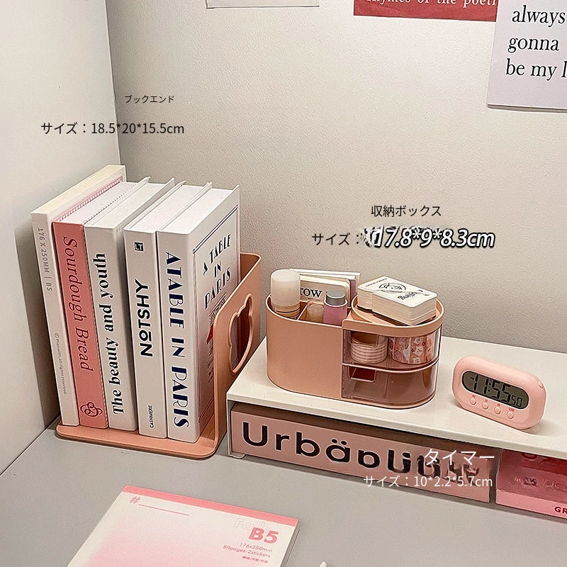 デスク整理ピンクの少女心セット|学生寮・書斎に最適!スマホスタンド、ブックエンド、目覚まし時計、文房具収納ボックスが揃った可愛いアイテムで、あなたの勉強空間を華やかに彩ります!